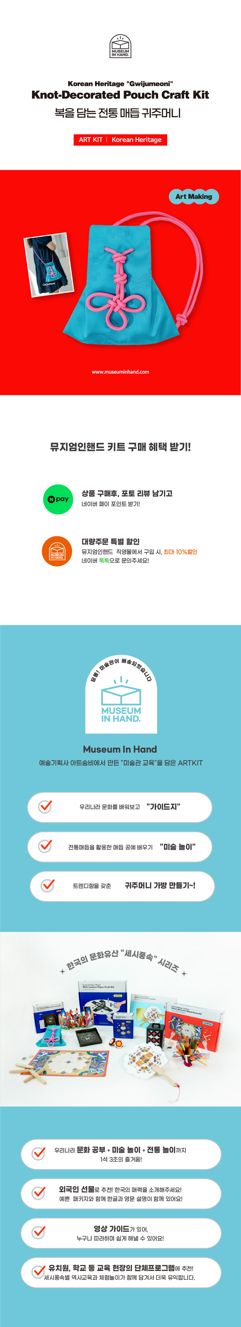 생쪽매듭과 도래매듭을 직접 배워보고, 한국의 전통 귀주머니를 완성해볼 수 있는 키트입니다.