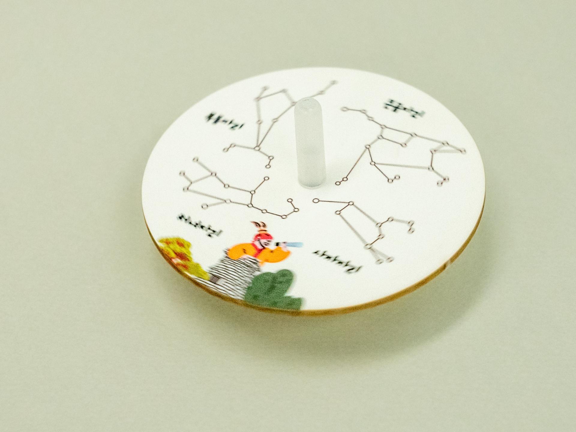 원판 모양의 팽이에 반짝이는 비즈 스티커를 붙여 나만의 별자리 팽이를 만들어봐요.