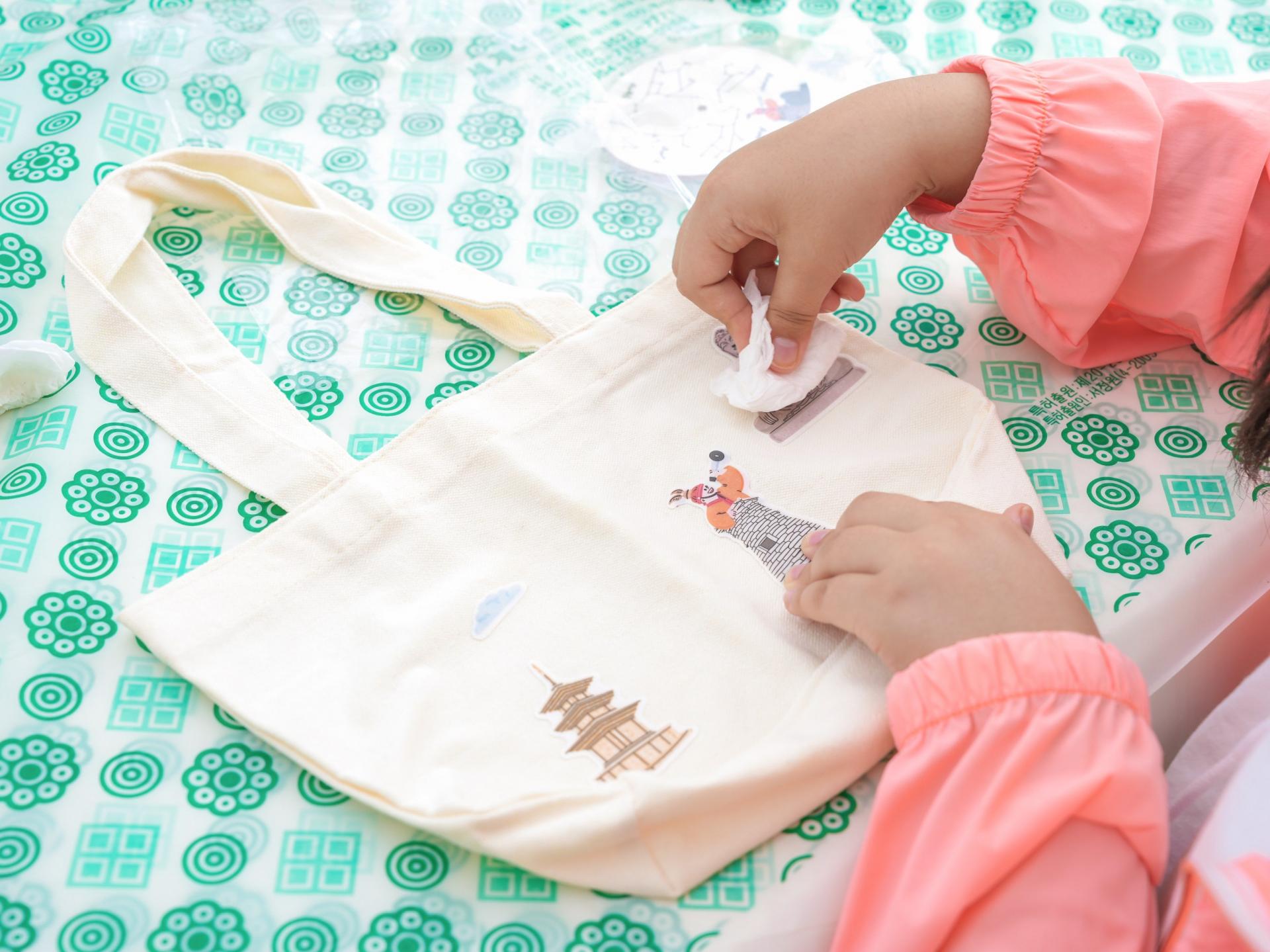 15분 | 판박이 붙이기: 판박이 뒷면의 비닐을 떼고 에코백 위에 올려 물로 적시고 두드리기 | |