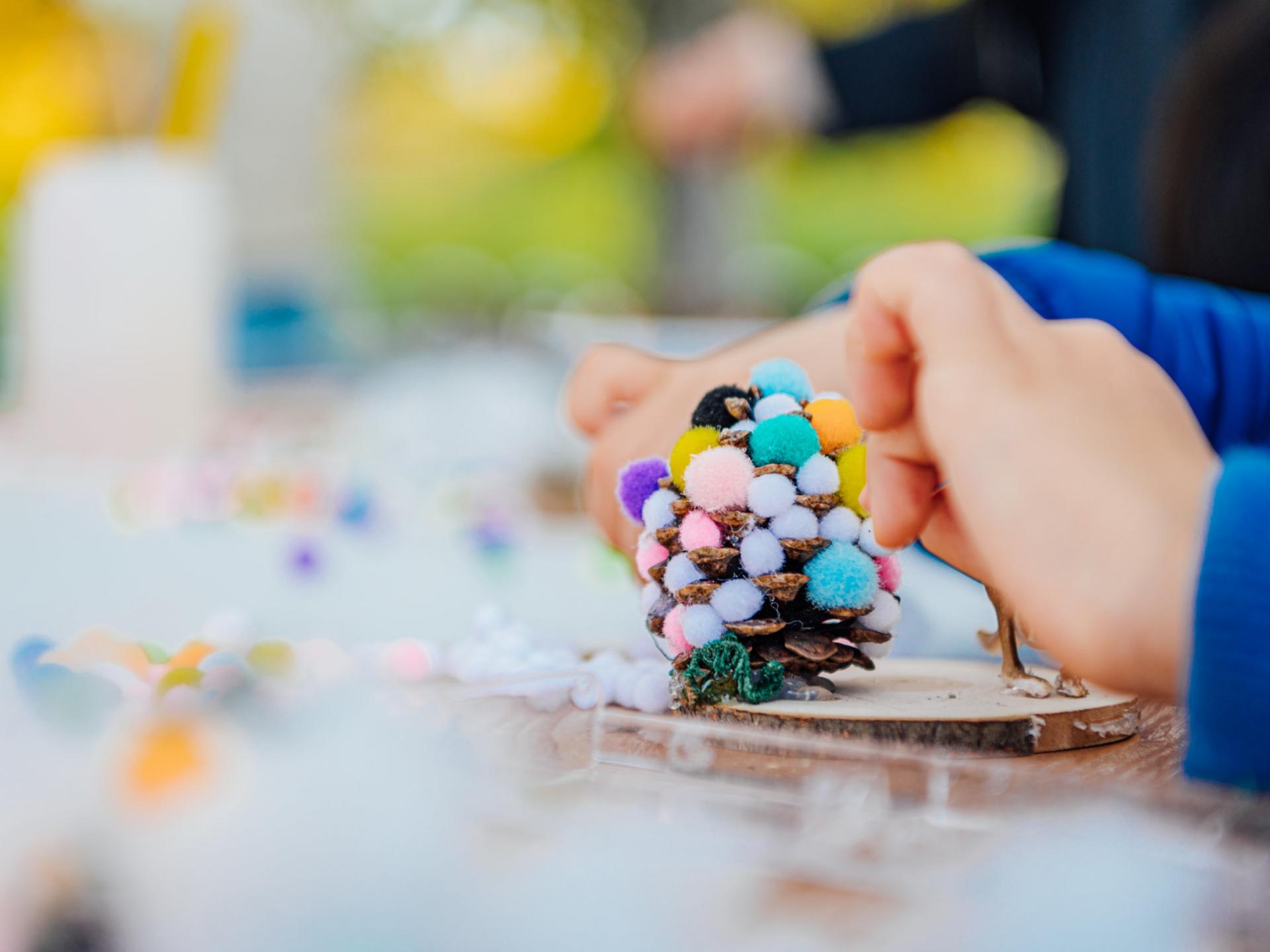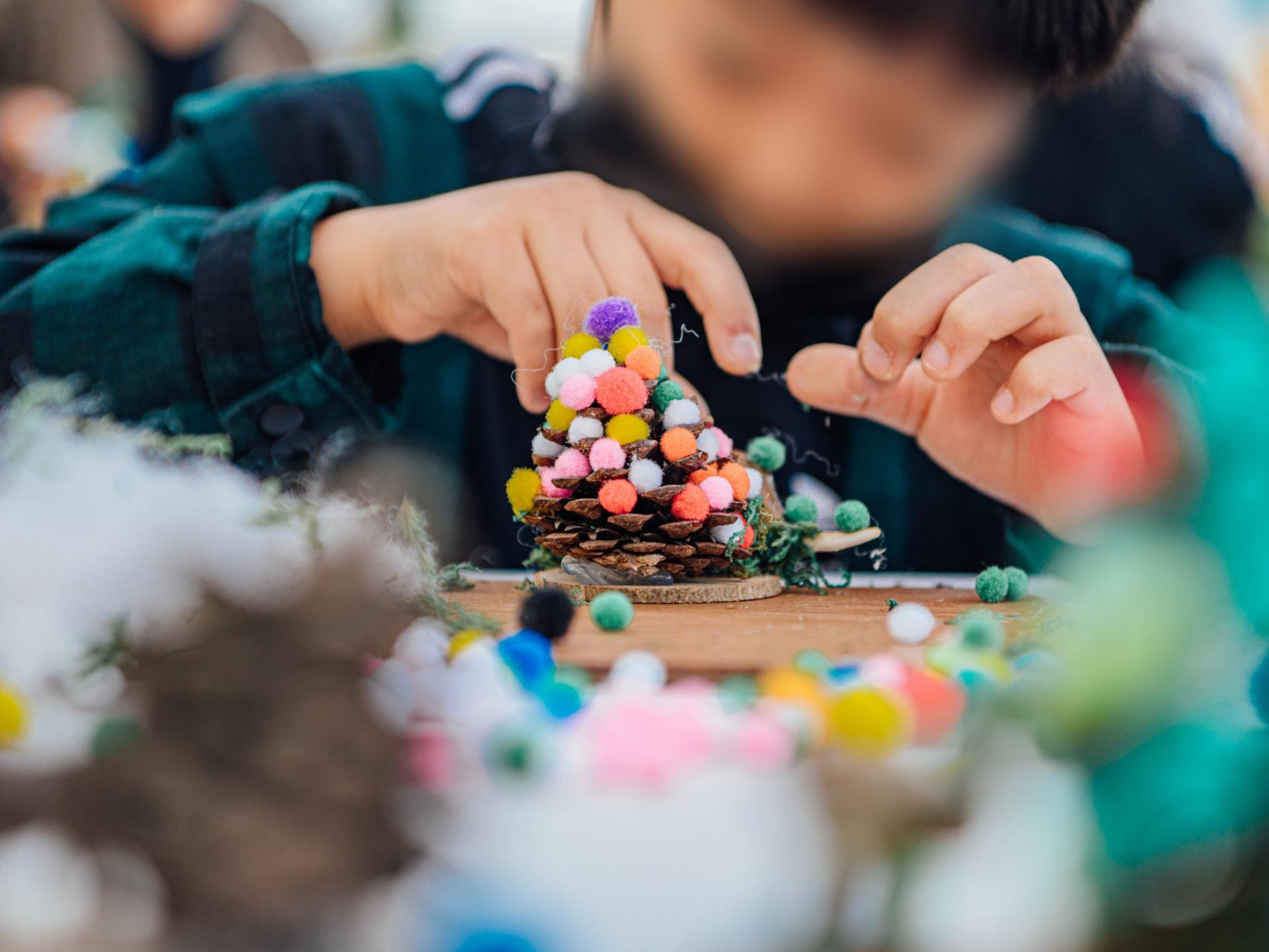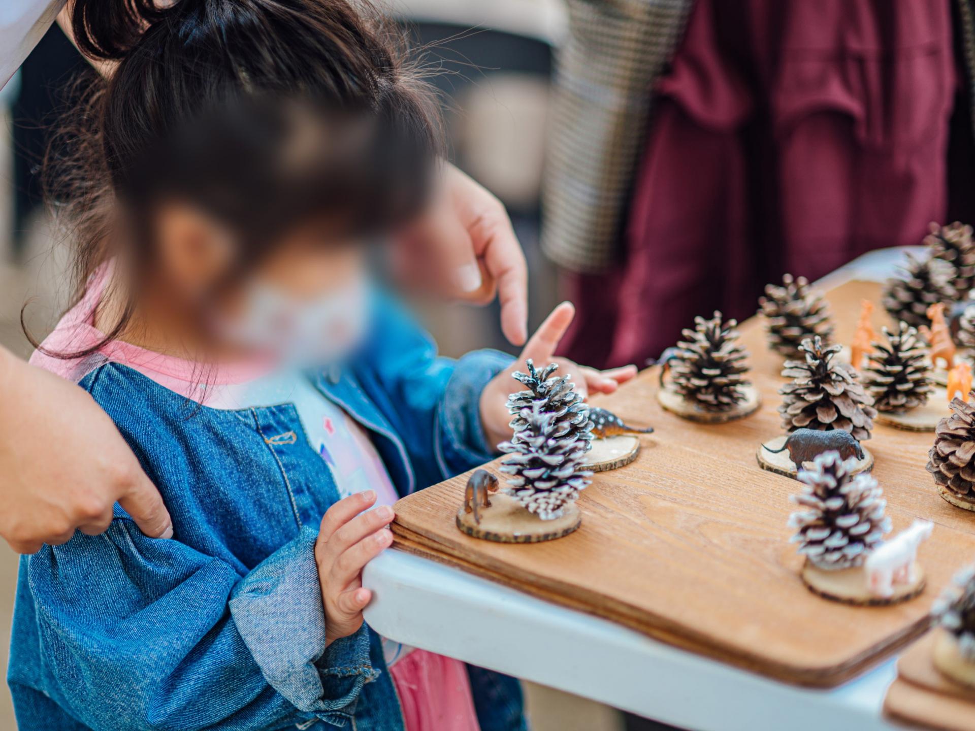 솔방울과 동물 모형, 장식 재료를 활용해 작은 동물원 오브제를 구성해보는 조형 체험이에요.