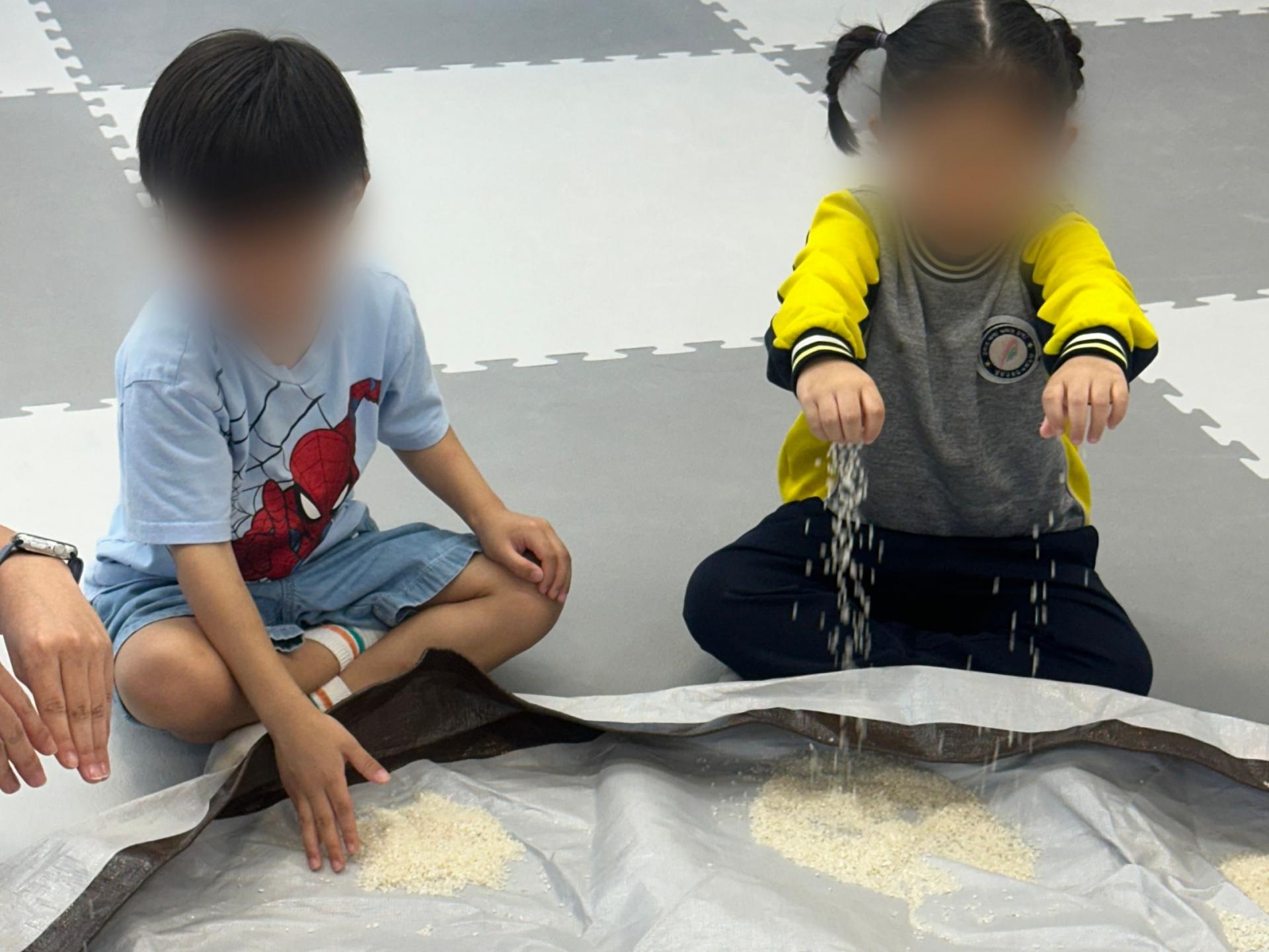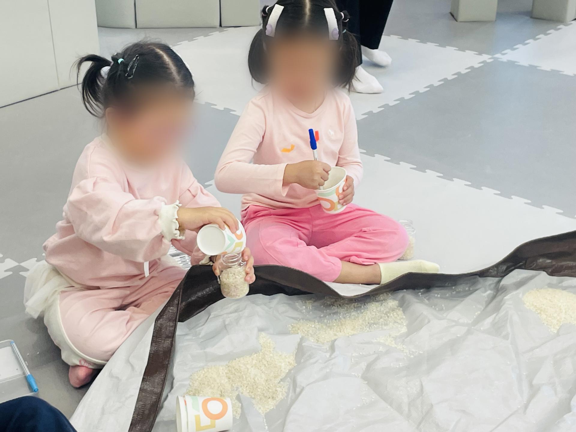 쌀에 색을 입히고 병에 담아 흔들어보며 색과 소리를 함께 경험하는 감각 중심 체험이에요.