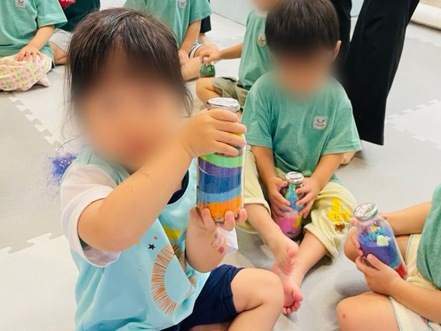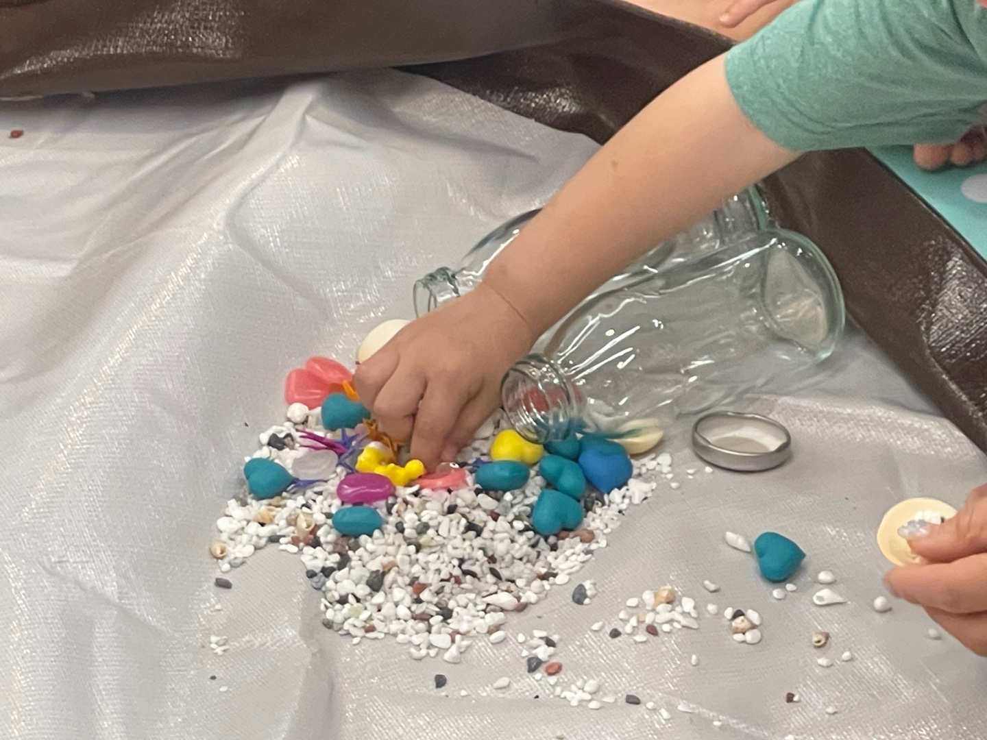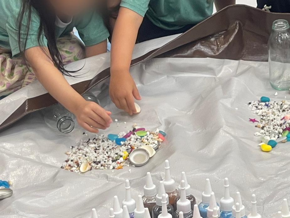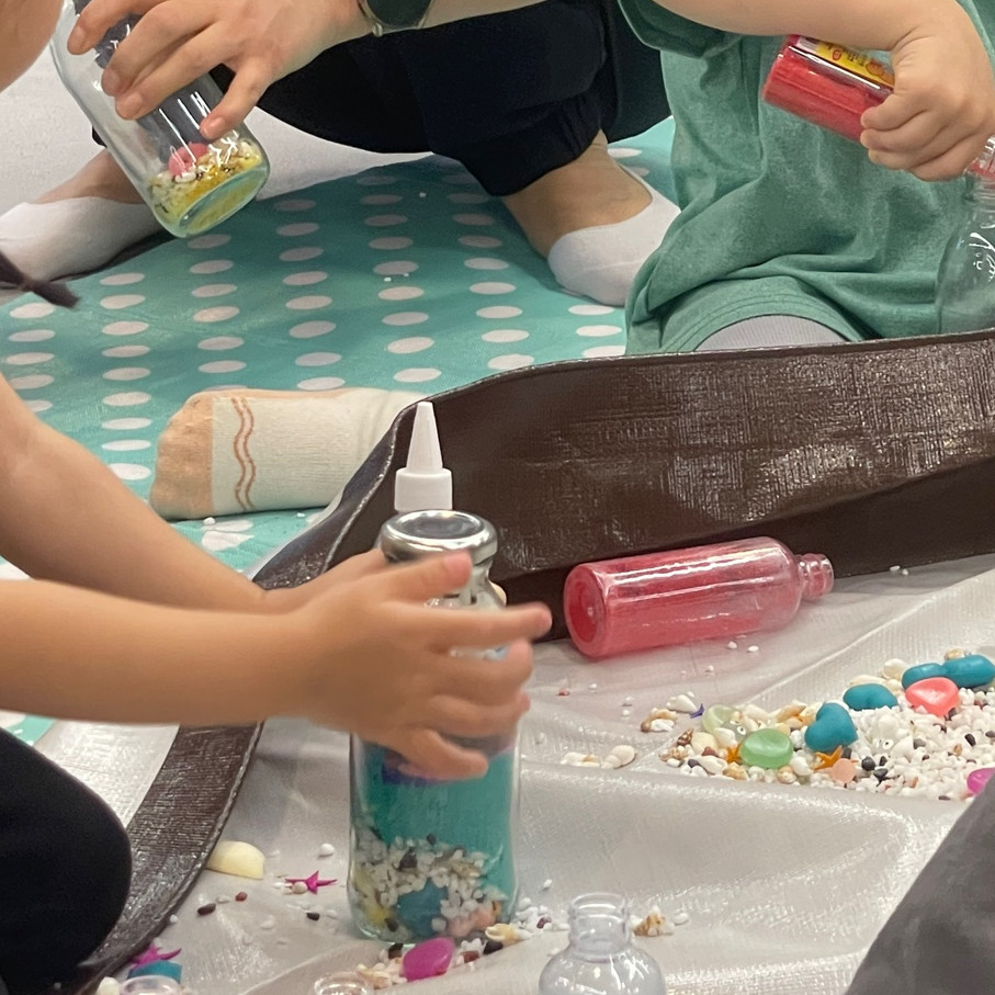 조개, 자갈, 모래 등 다양한 자연 재료를 병에 담아 흔들며 소리의 차이를 느껴보는 친환경 사운드 체험이에요.