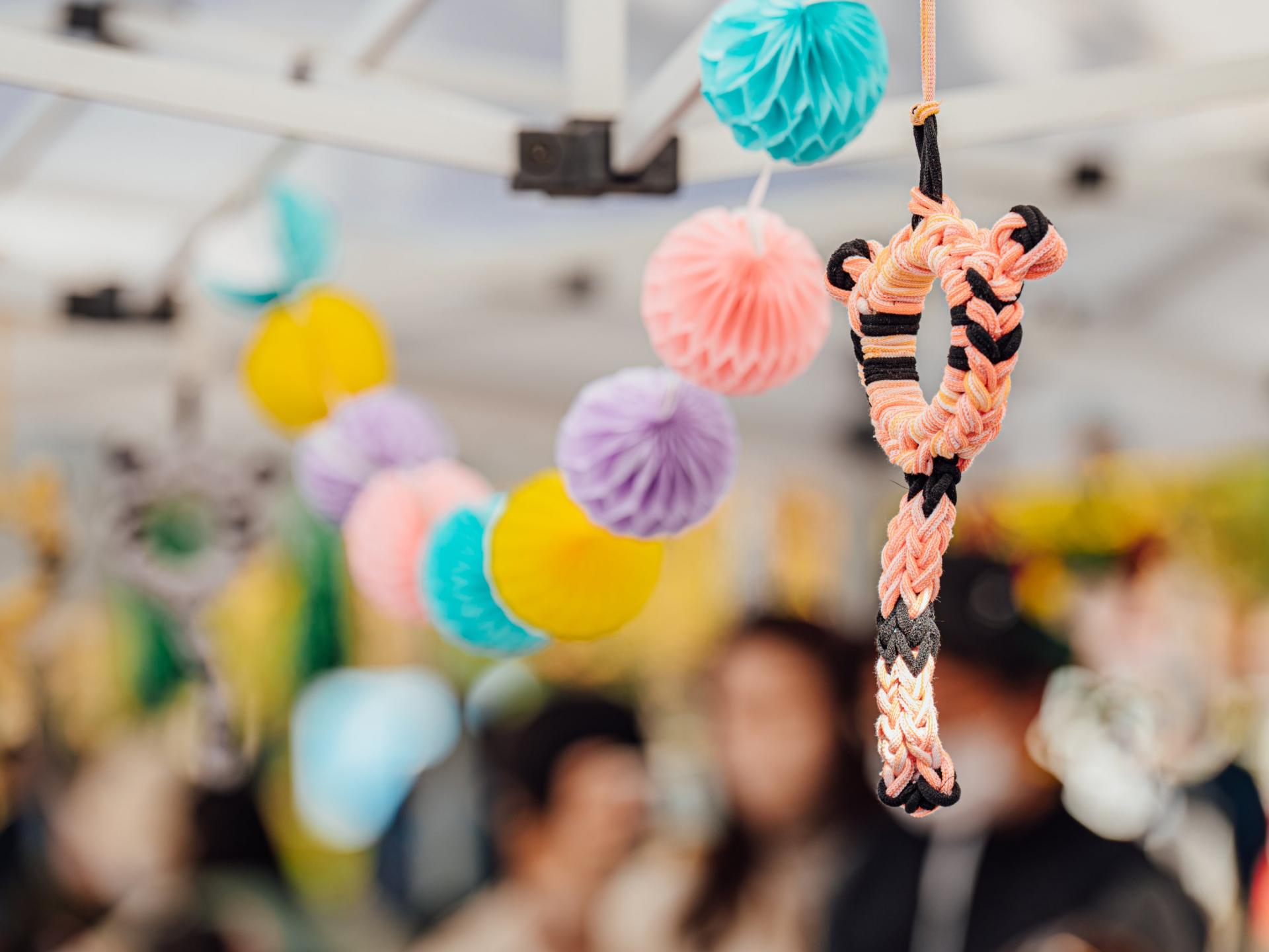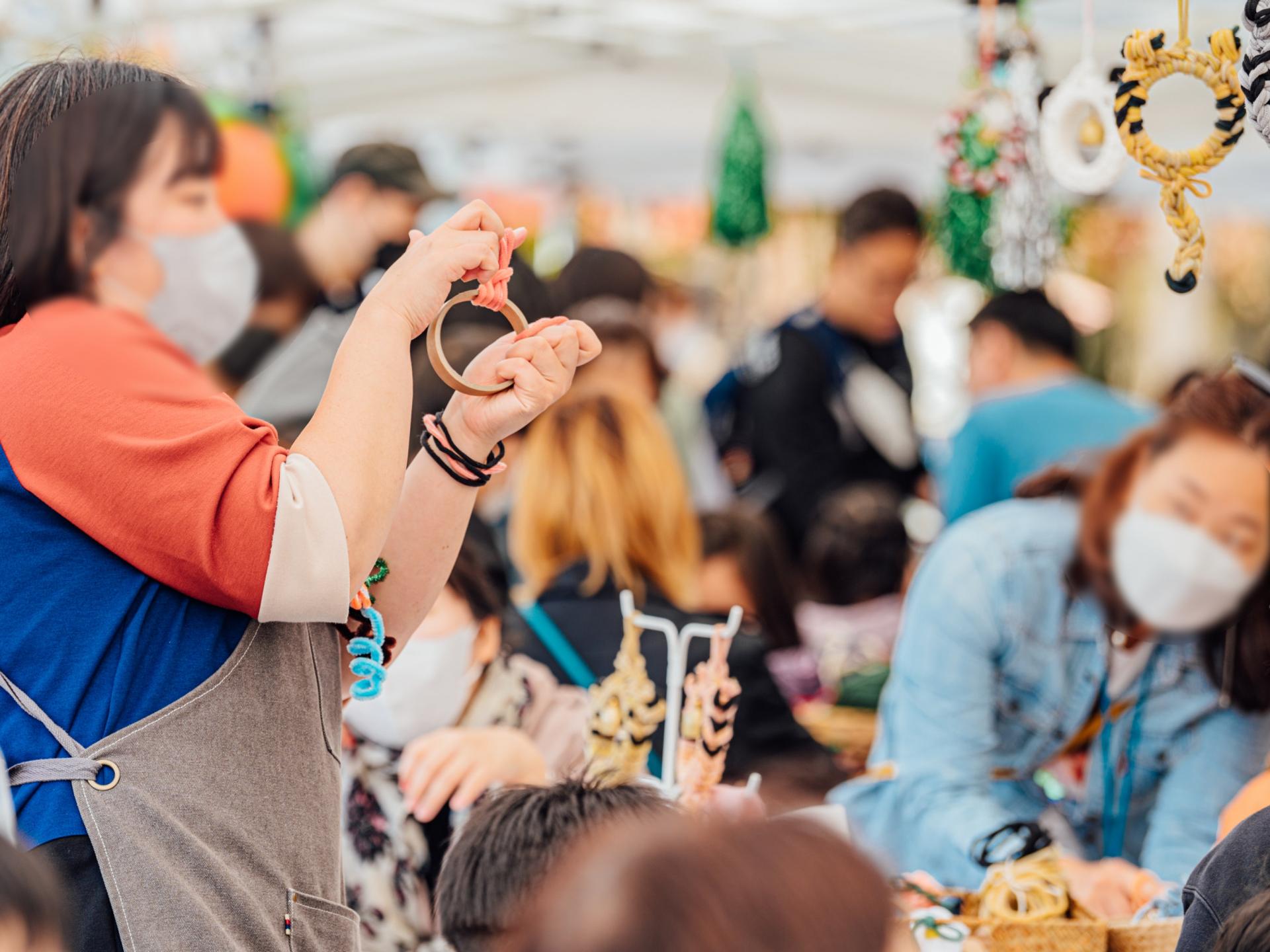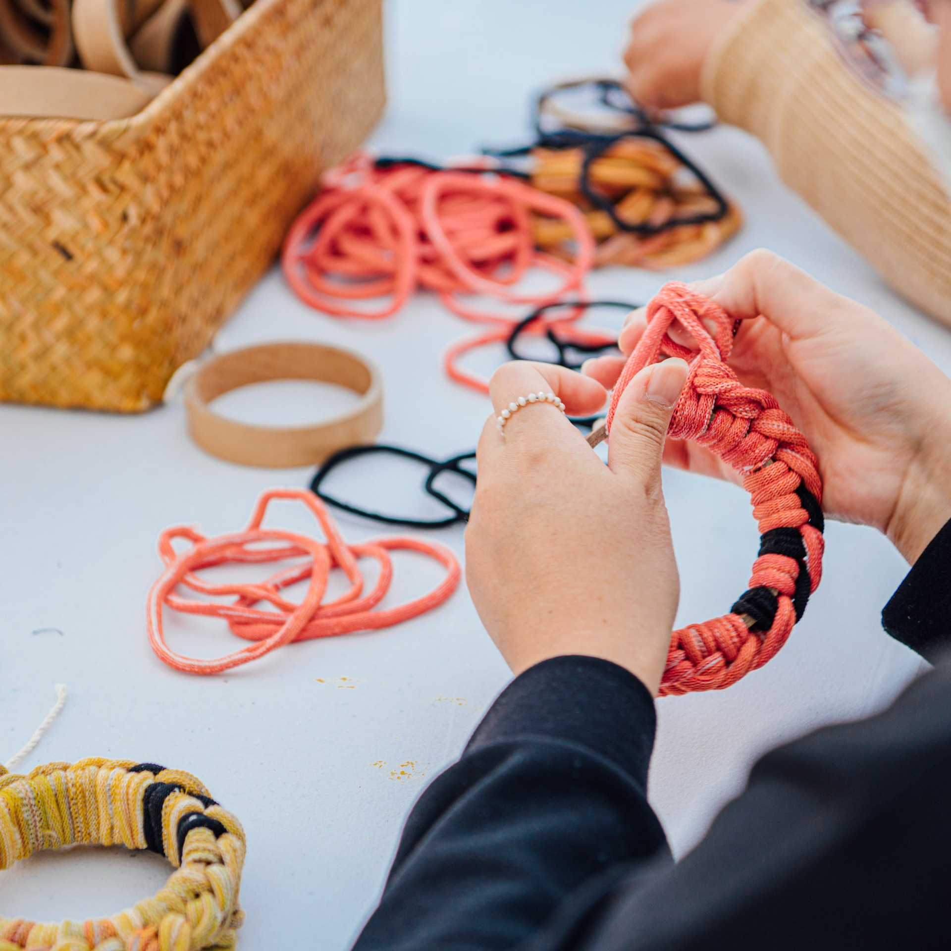30분 | 소재 엮기: 가이드를 보며 양말목 뜨개 방법을 익히고 우드링에 매듭 짓기 | |