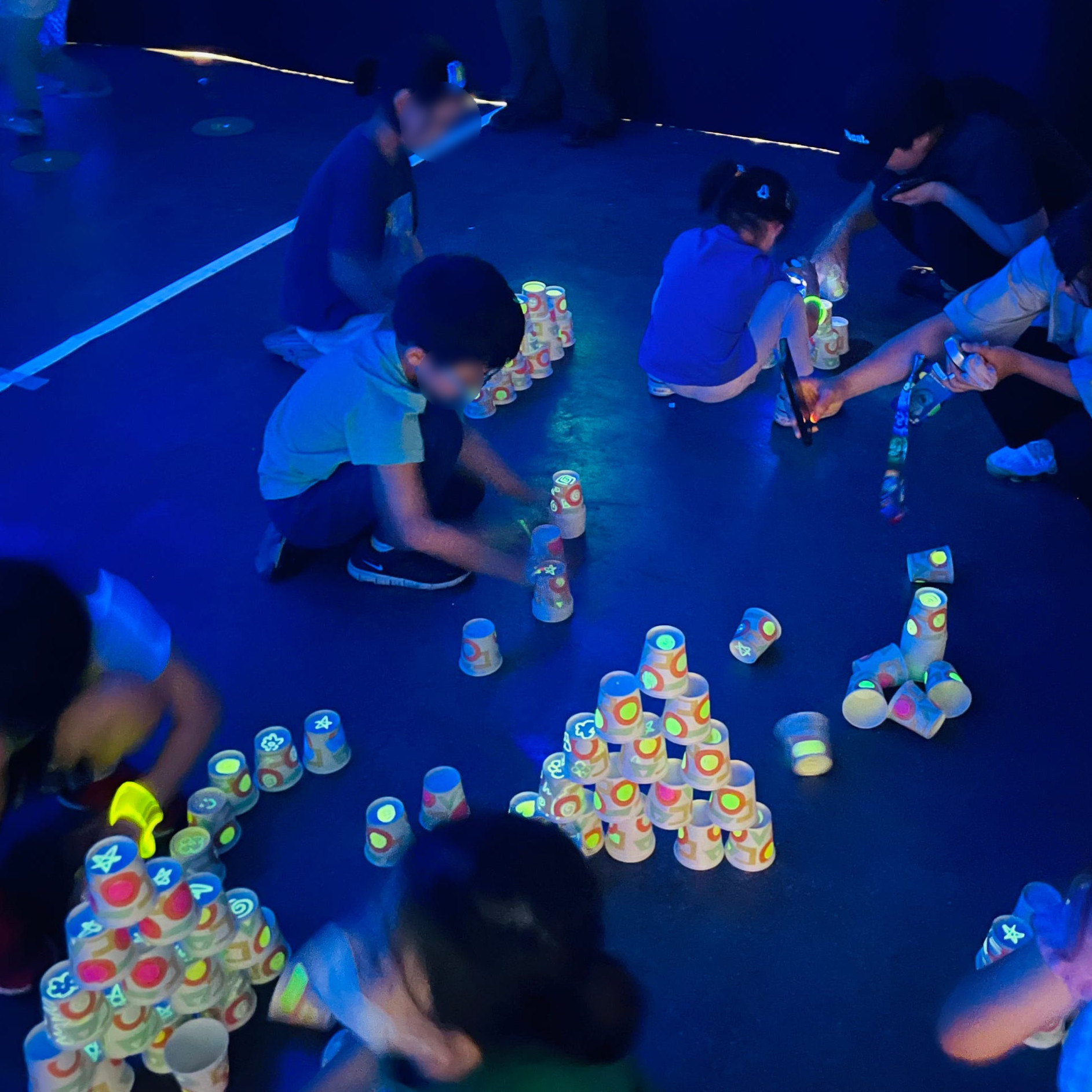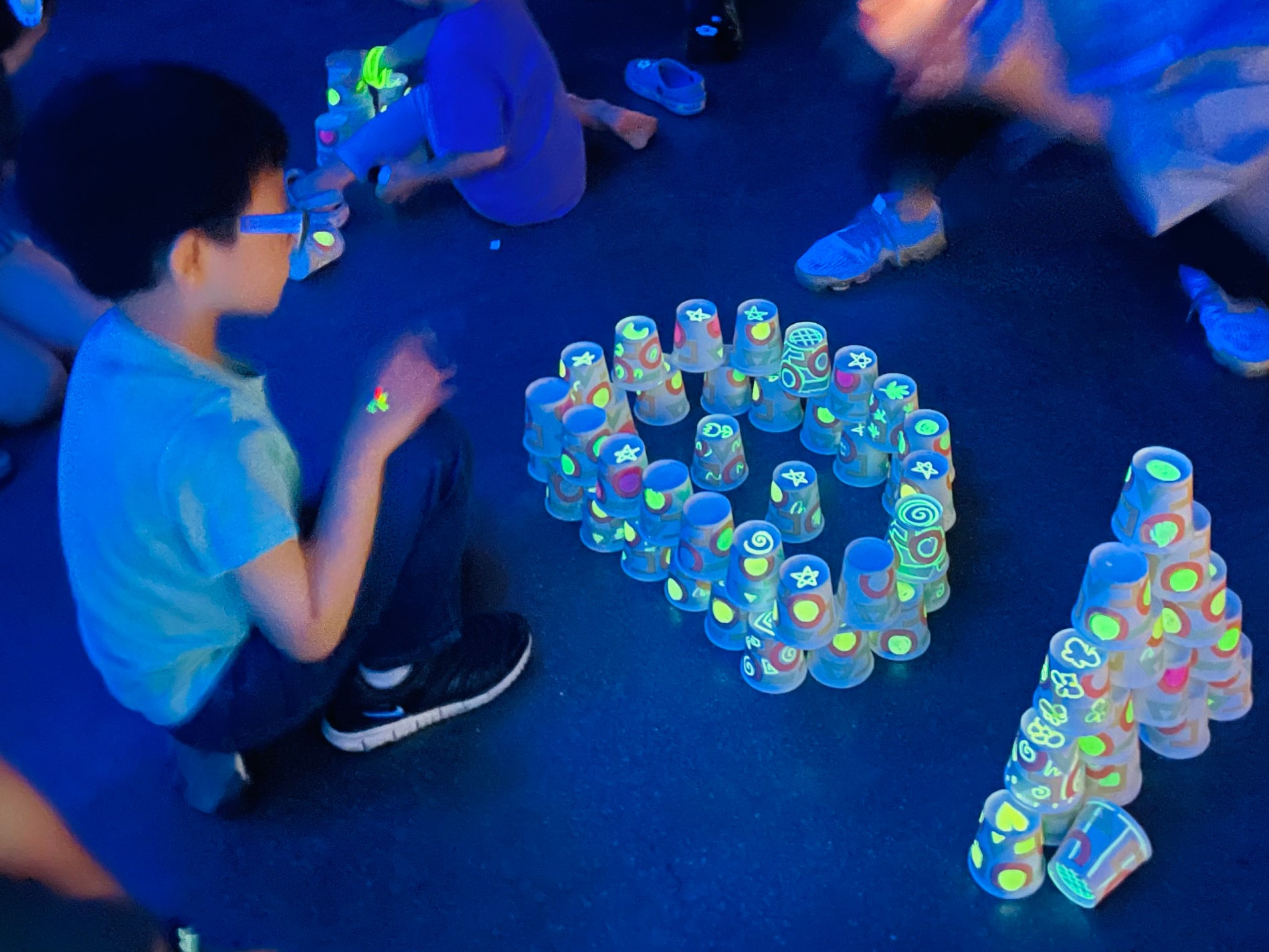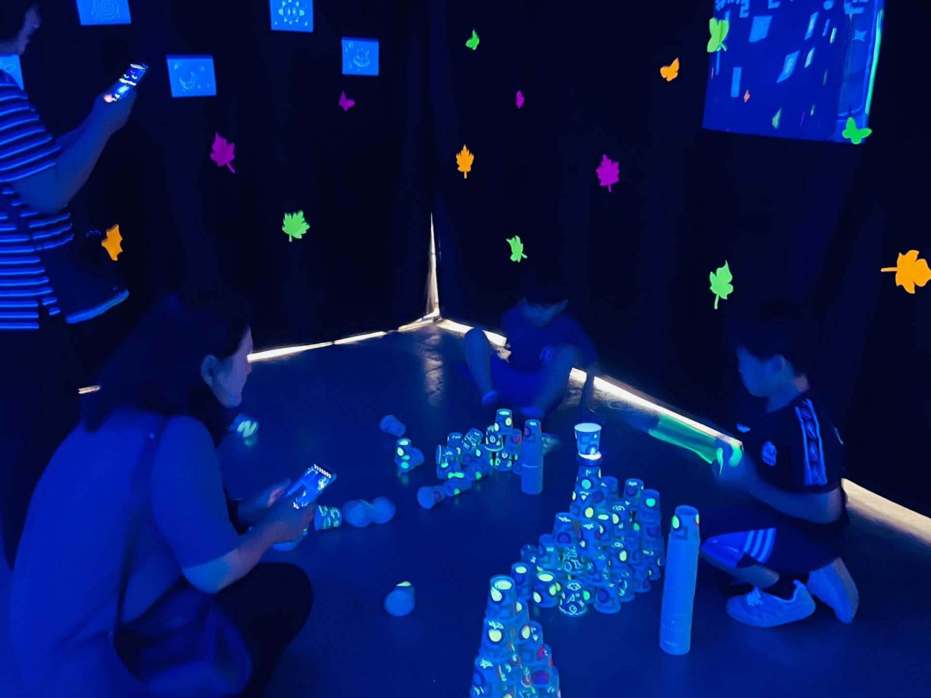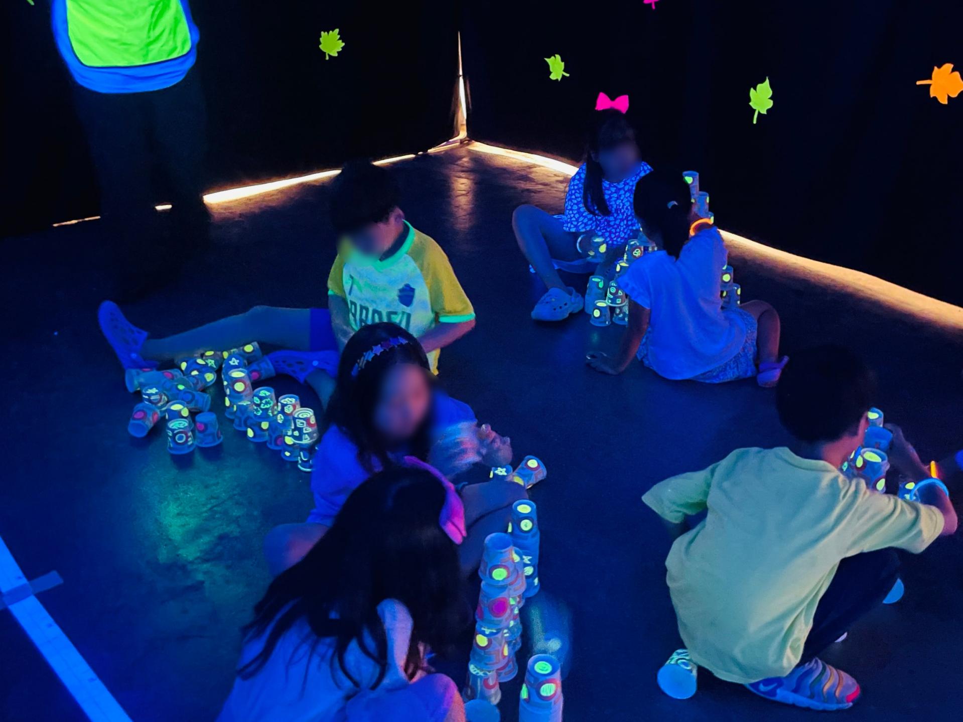 블랙라이트로 조성된 공간 안에서 컵에 형광 물감으로 그림을 그리고, 그 컵을 쌓아 성을 만들어보는 체험이에요.