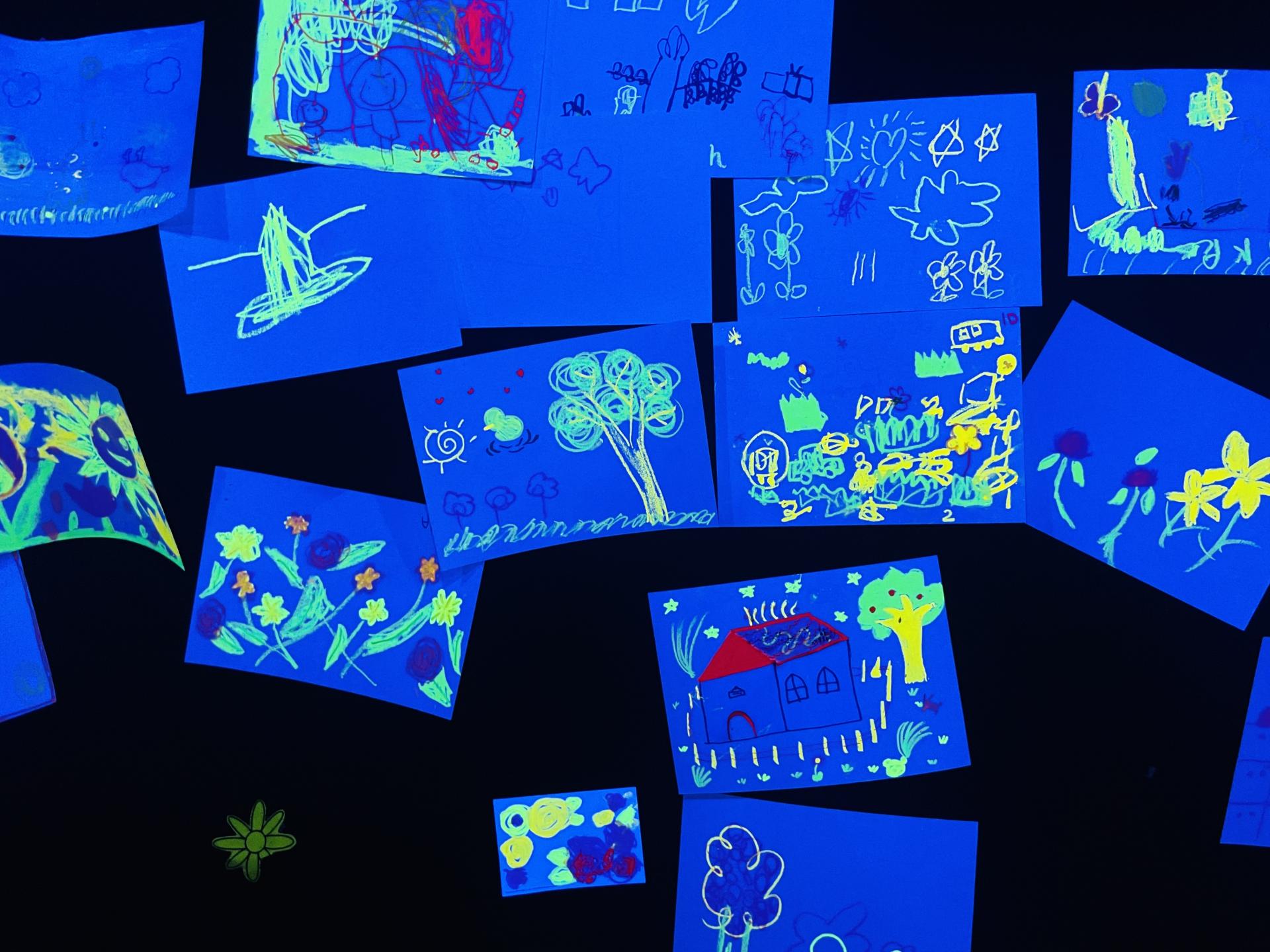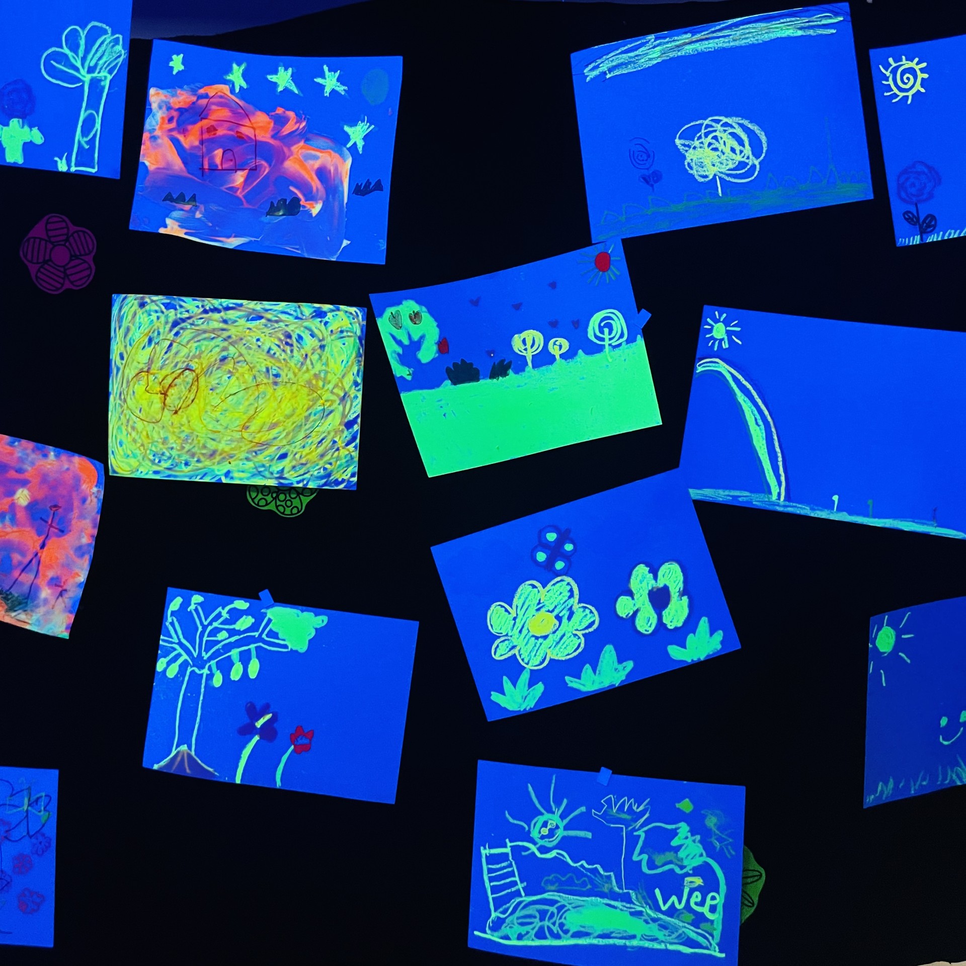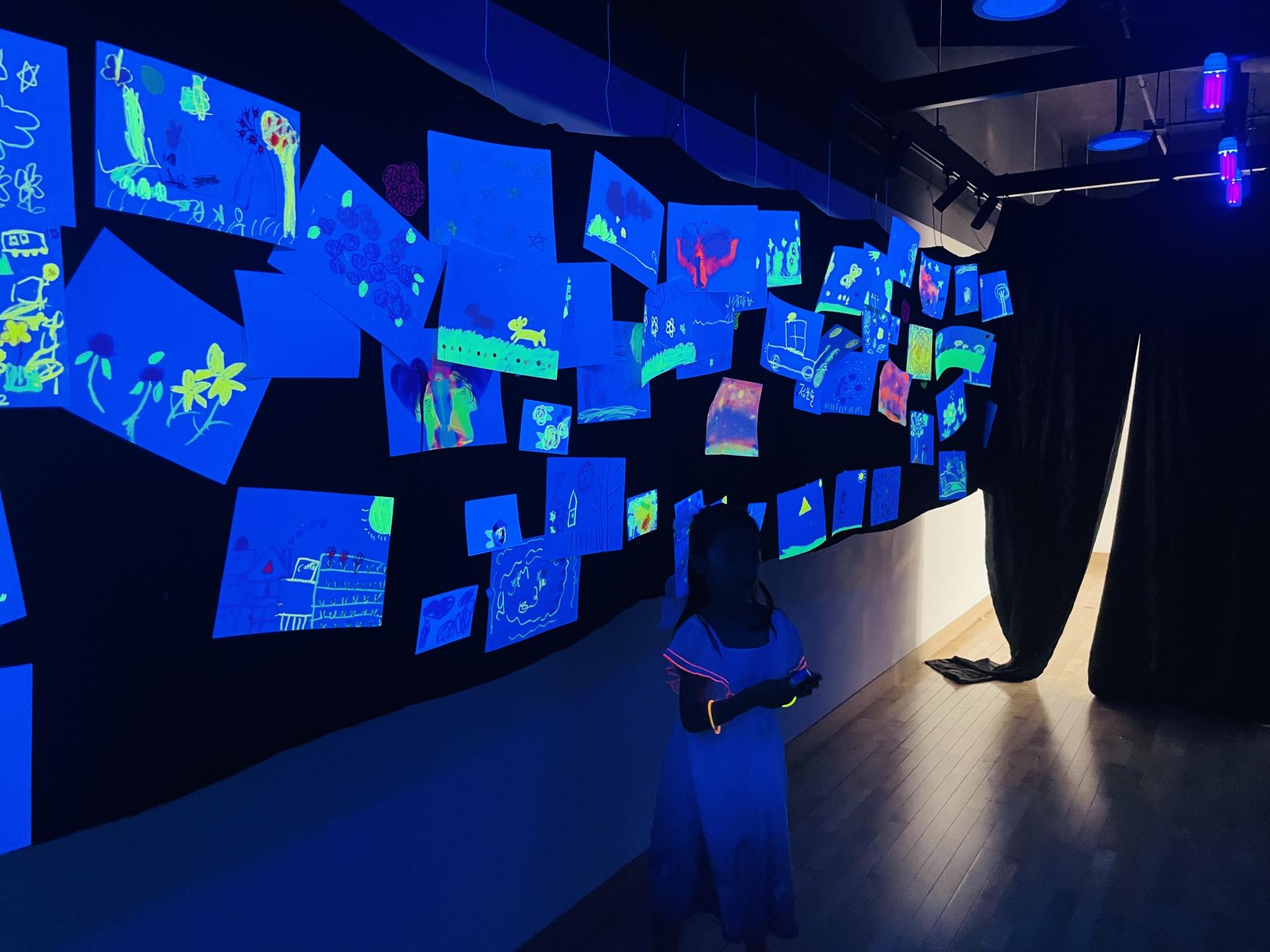 블랙라이트로 조성된 공간 안에서 형광 물감으로 그림을 그리고 전시까지 이어지는 미술 체험이에요.