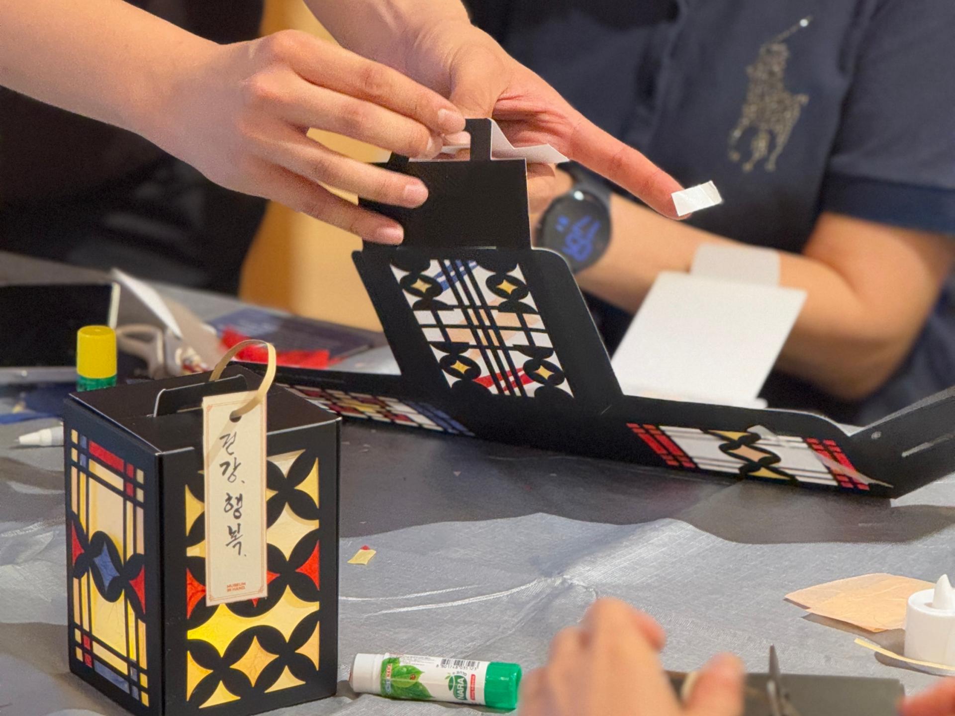 꾸며진 한지를 구조에 맞게 조립하며 전통등의 형태를 완성합니다.