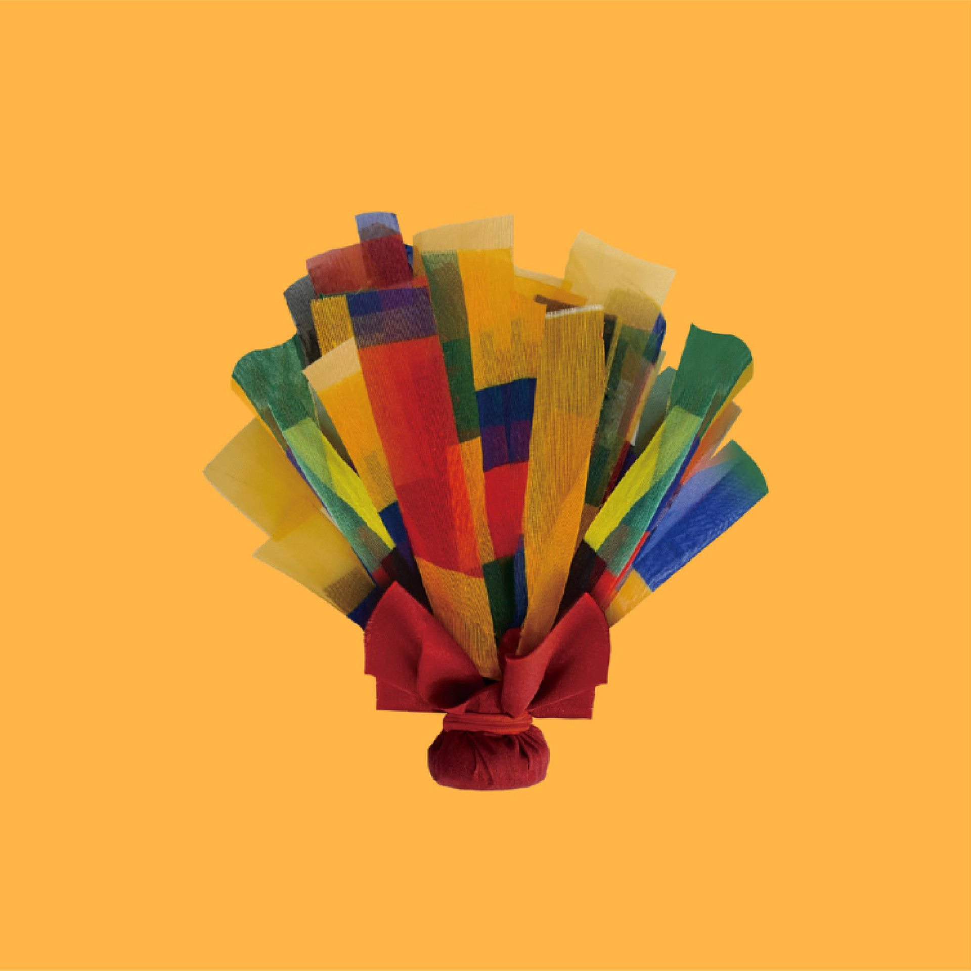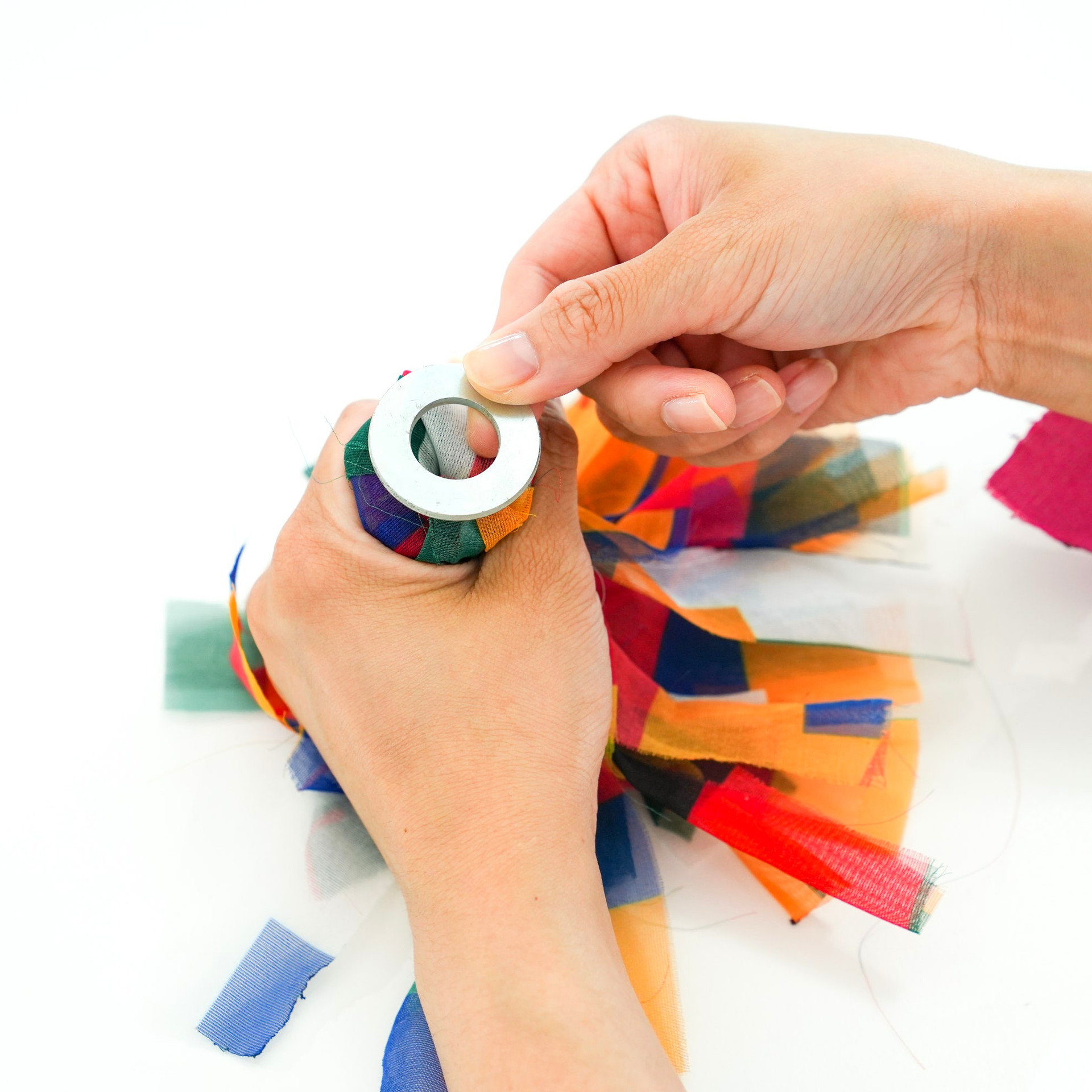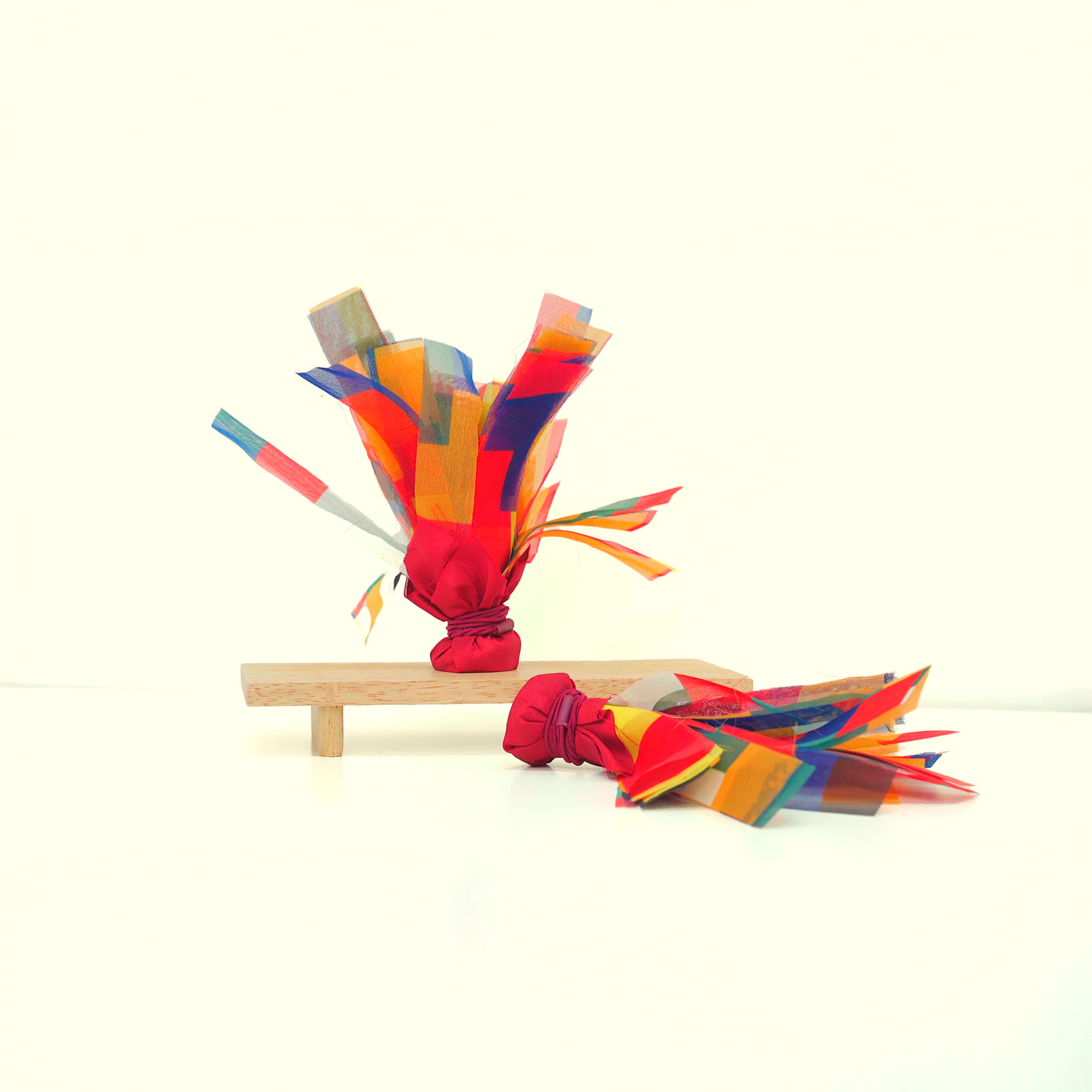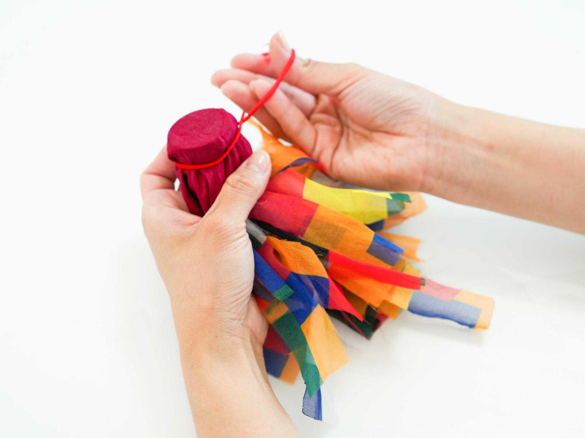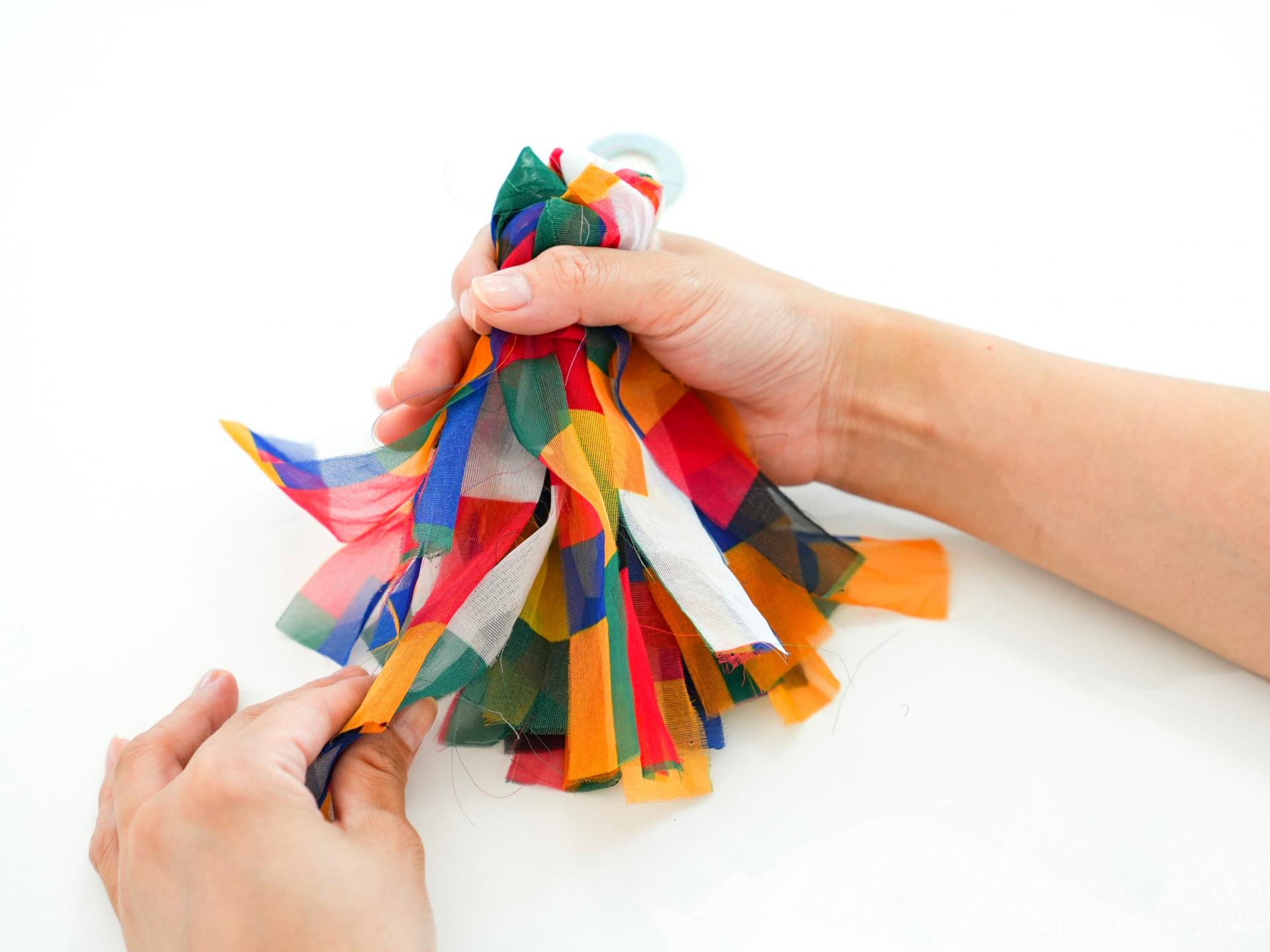 오방색 천과 장식 재료를 묶고 정리하며 전통 제기의 형태를 만들어 나갑니다.