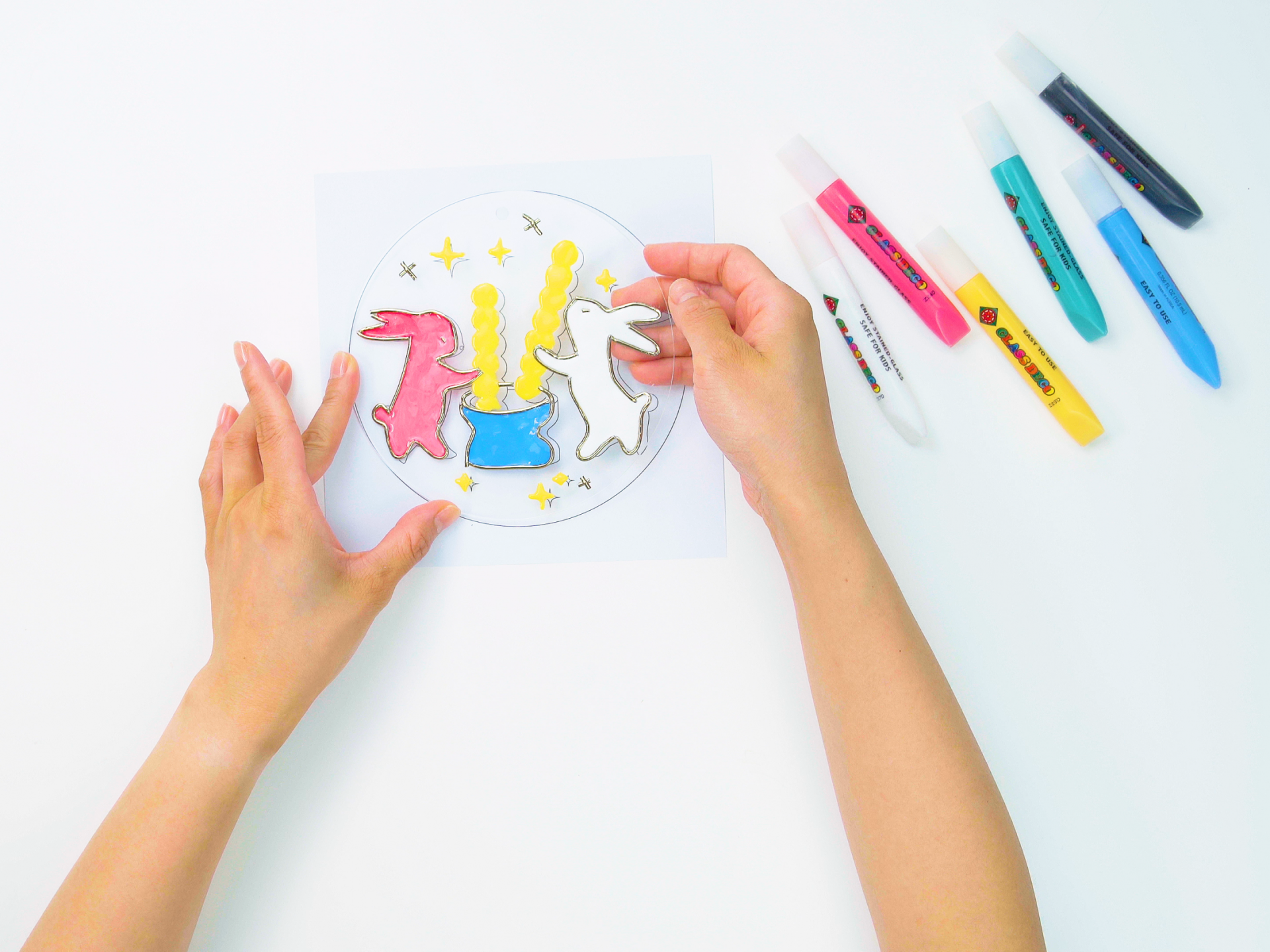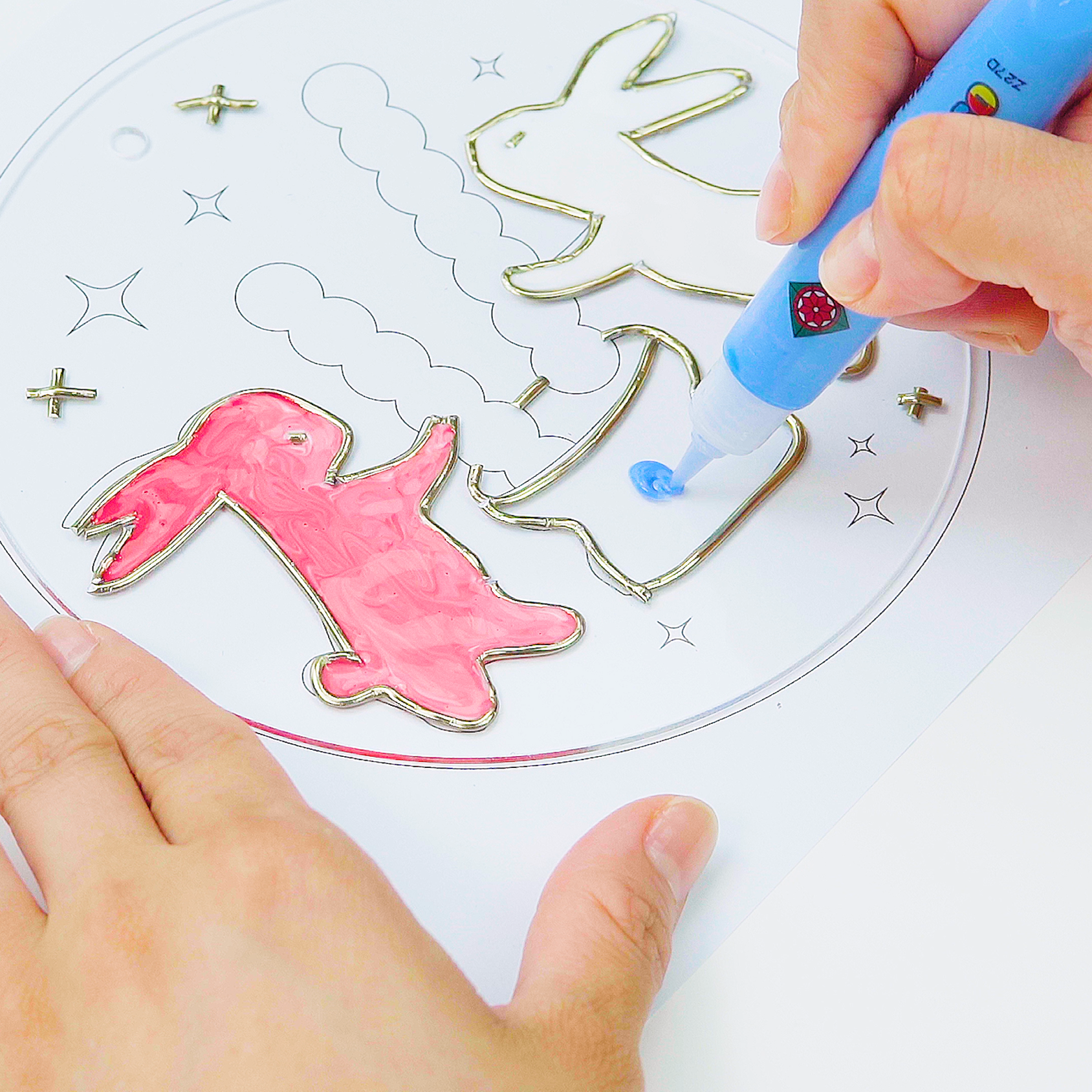 이제 글라스 데코 재료를 활용해 투명 아크릴 위에 달토끼 이미지를 채색합니다.