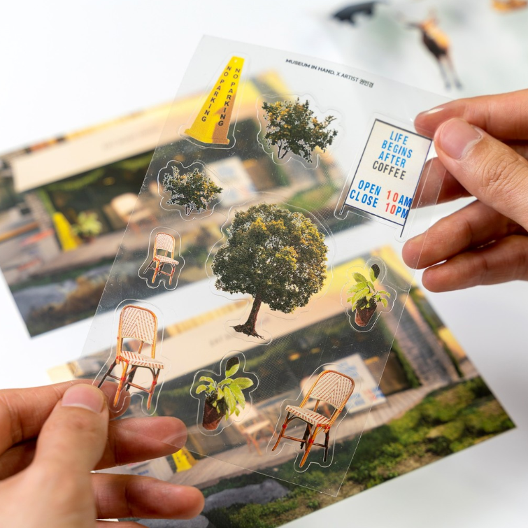 스티커를 배치해 일상과 상상이 함께 담긴 화면을 구성합니다.