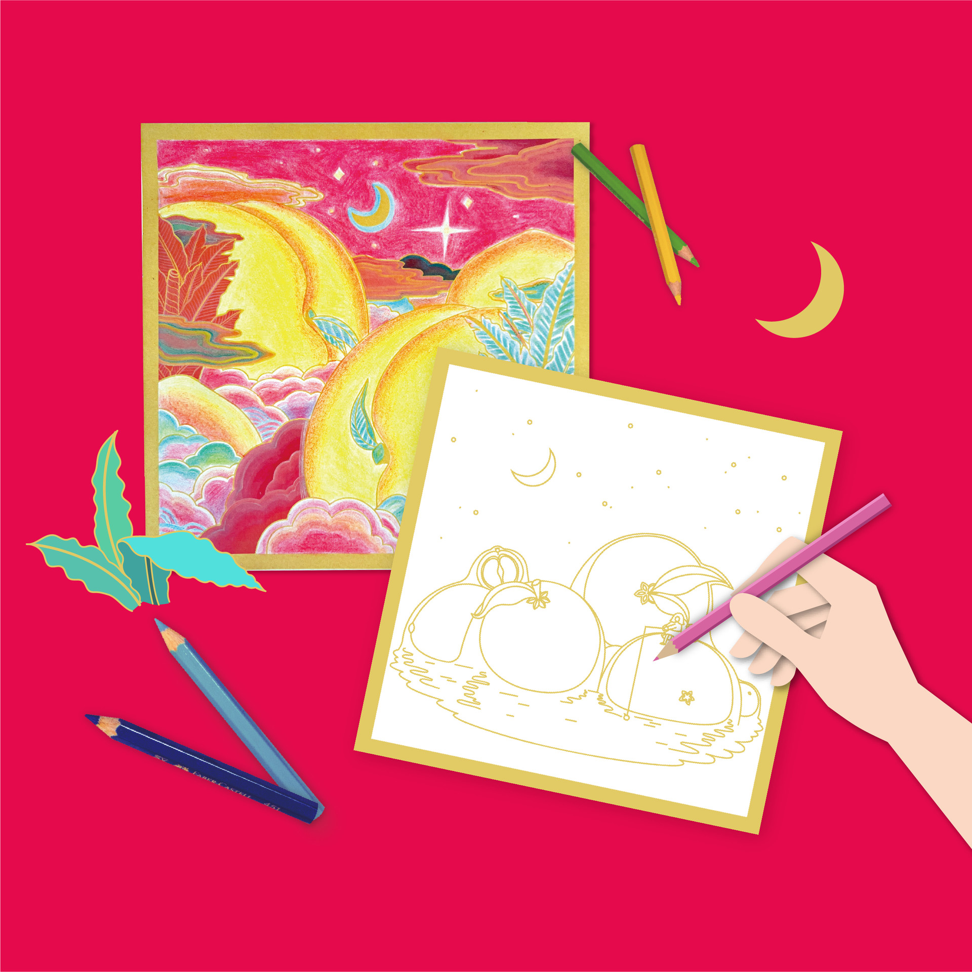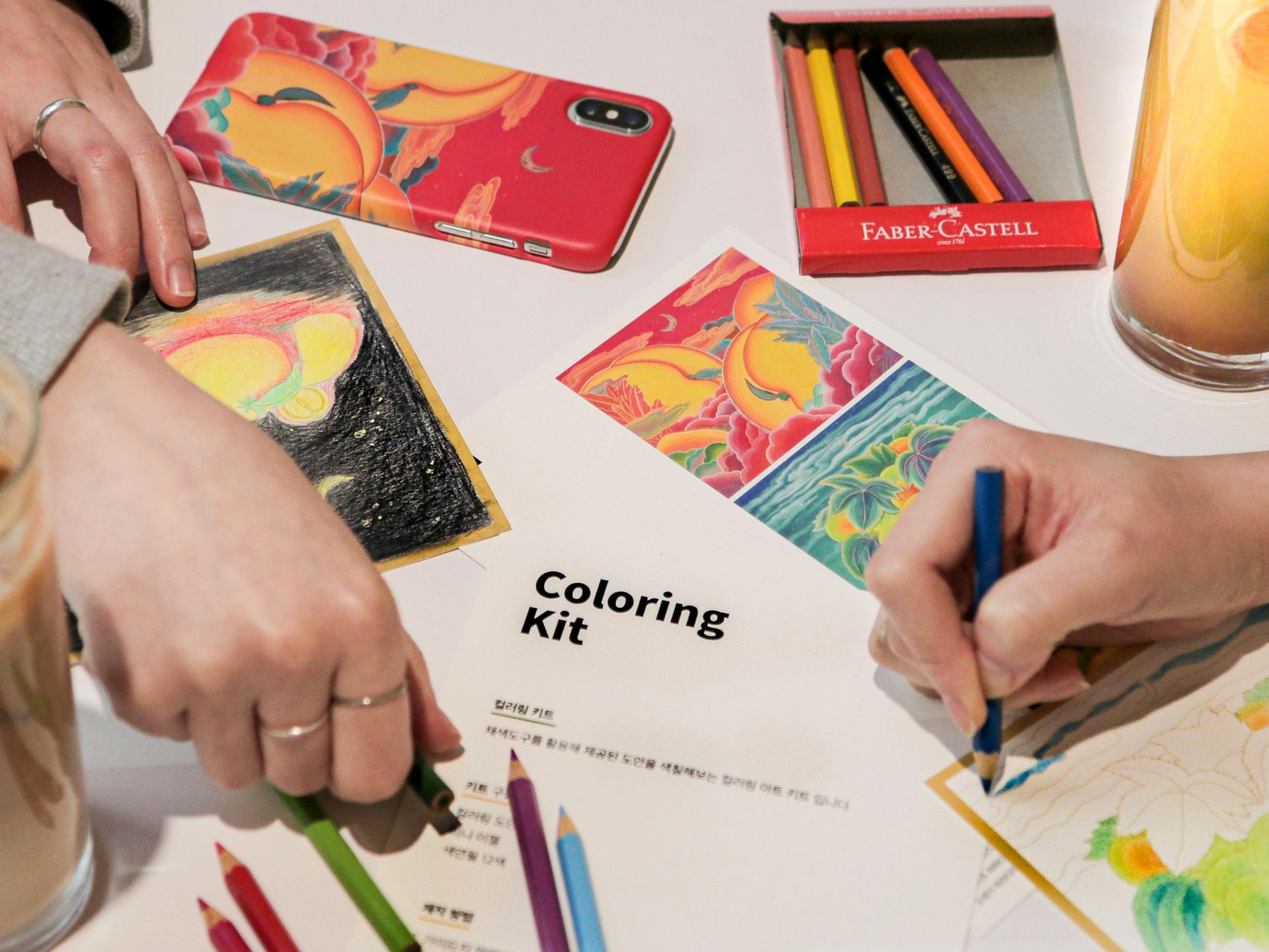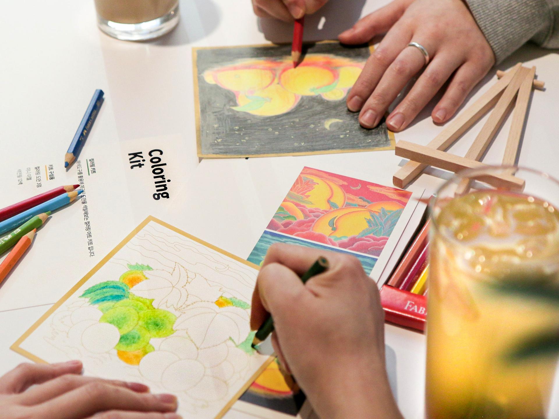이후 색연필을 활용해 자신만의 색 조합과 분위기로 도안을 채색합니다.