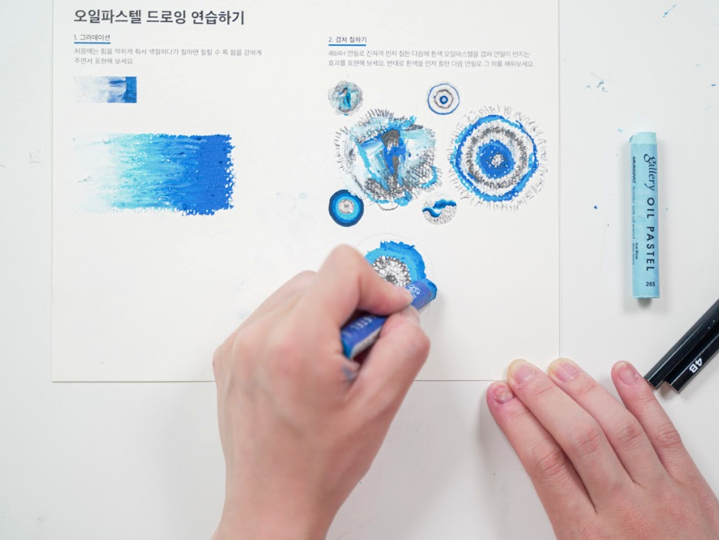 부드럽게 번지는 성질과 겹쳐지는 색의 밀도를 살펴보며 재료가 화면에 남기는 흔적을 직접 확인합니다.