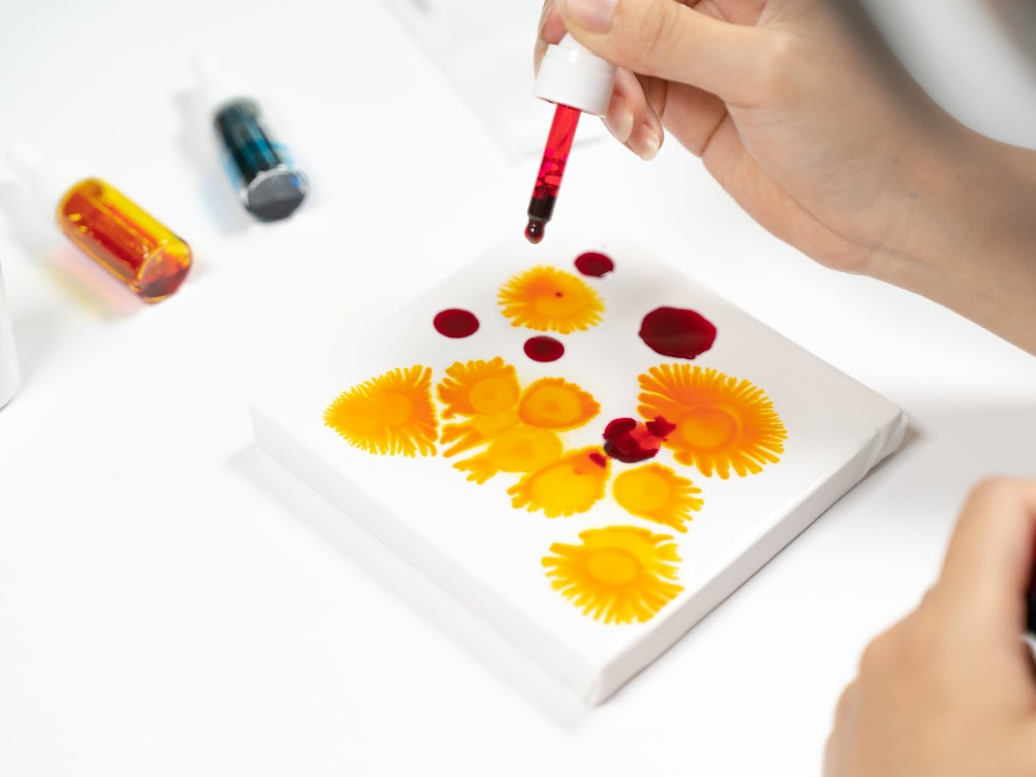 준비가 끝나면 스포이드를 사용해 빨강·노랑·파랑 잉크를 떨어뜨립니다.