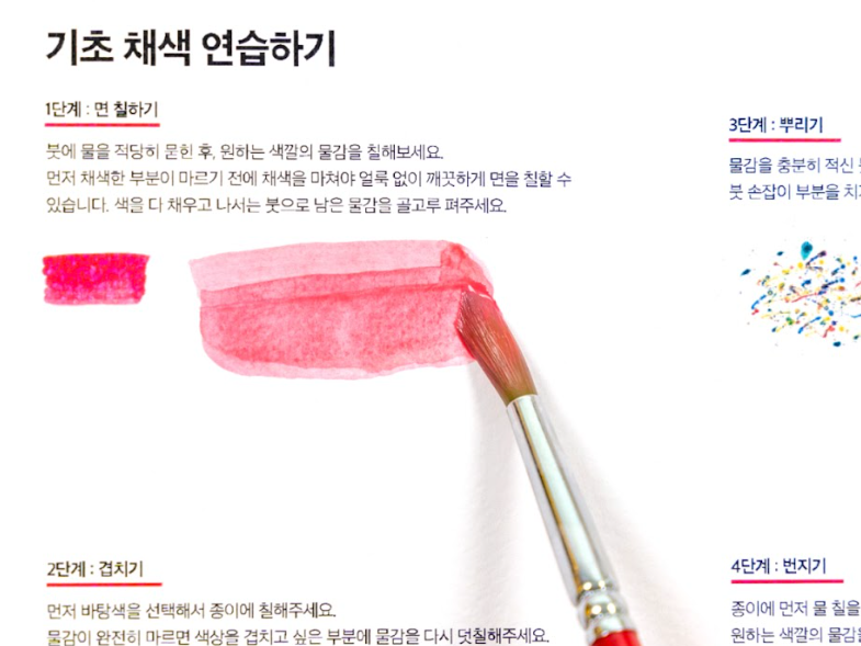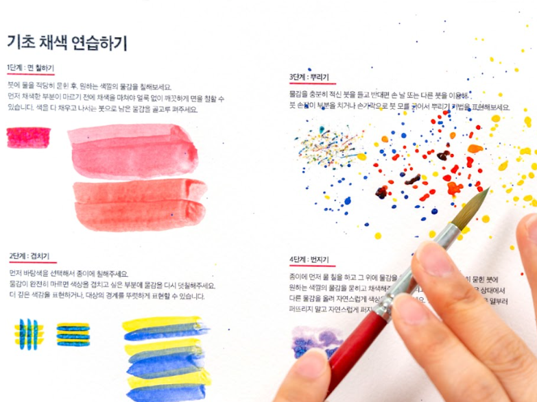 이어 물의 양과 붓 터치에 따라 색이 번지고 겹쳐지는 수채화 표현 방식을 살펴봅니다.