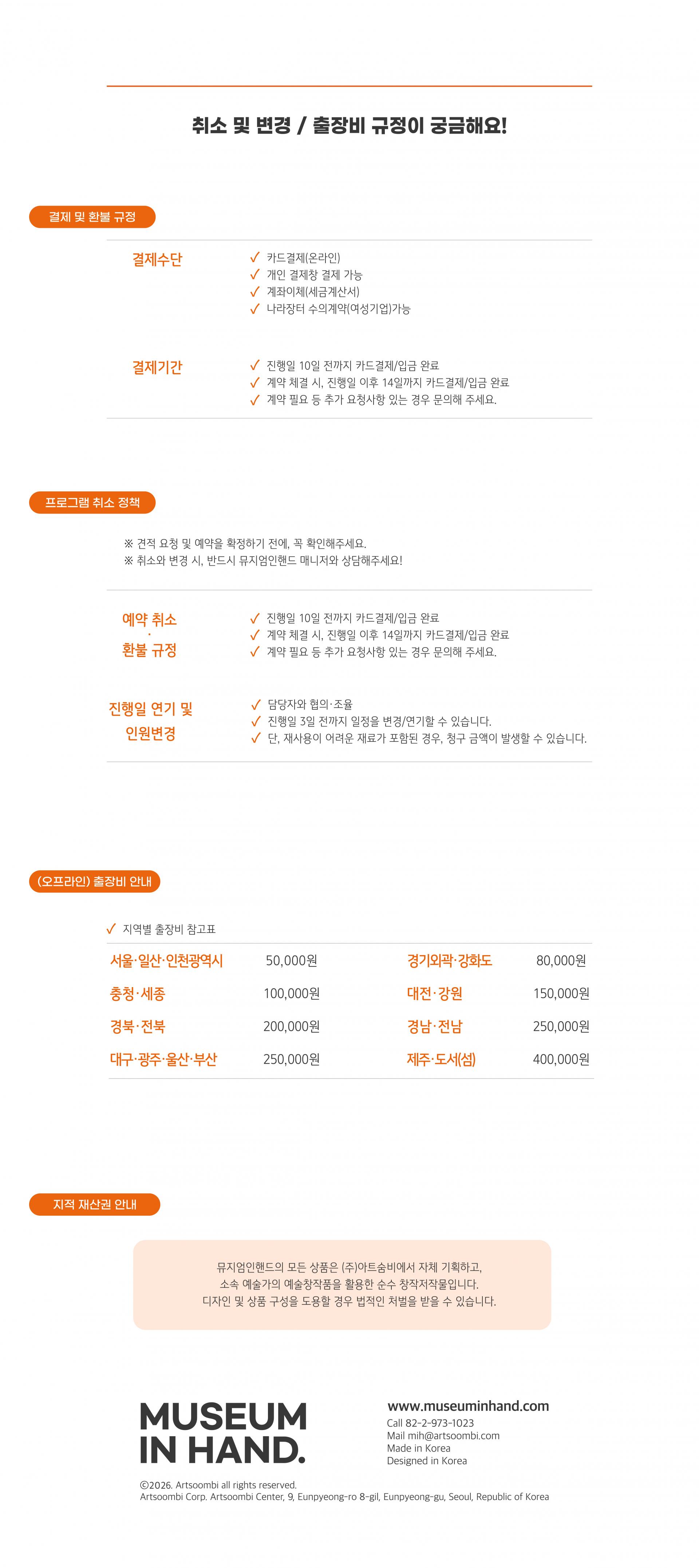 담당자 준비사항 | ✓ 장소 준비사항을 꼭 확인해 주세요. ✓ 추가 옵션을 확인해 선택해주세요. ✓ 강의 자료는 강의장에 USB로 가져갑니다. ✓ 강의장에 작품을 붙일 수 있는 벽면 상태를 꼭 확인해주세요. ✓ [온라인] 옵션의 경우, 미팅이 가능한 PC를 준비해주세요. ✓ [온라인] 키트 준비를 위해 배송 정보는 최소 7일 전까지 확정해주세요. ✓ 100명 이상의 대규모 워크샵 진행 시, 업체 측과 사전 미팅 여부를 확인해주세요. |