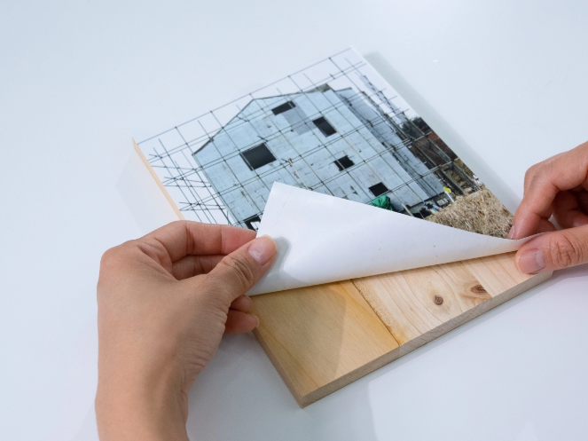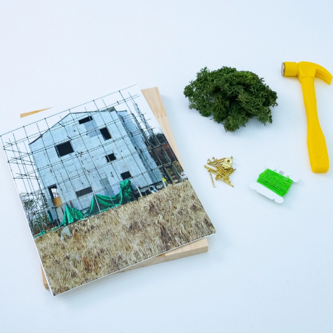 이어 건물 이미지를 나무 판 위에 고정하고 위치에 맞춰 못을 박습니다.