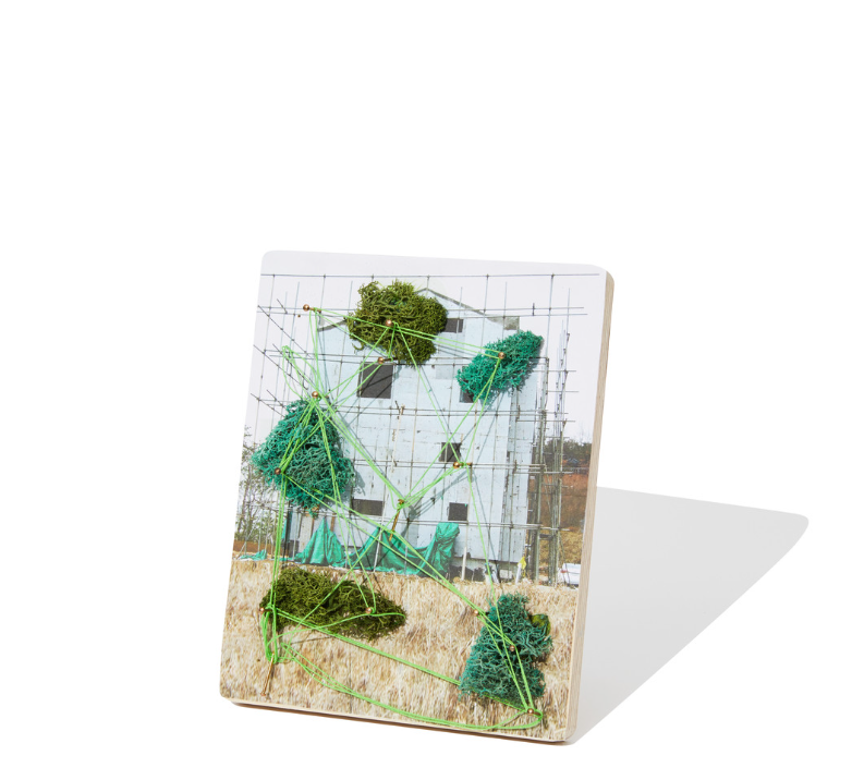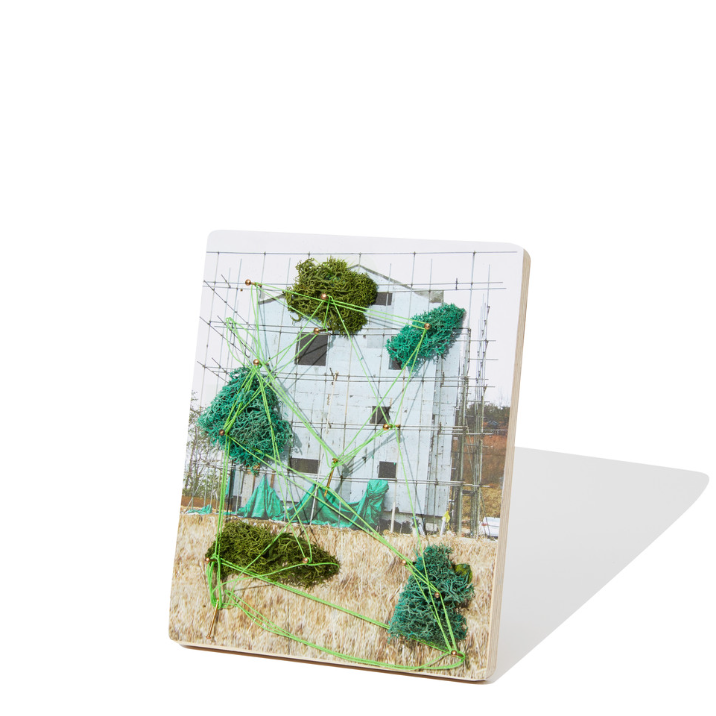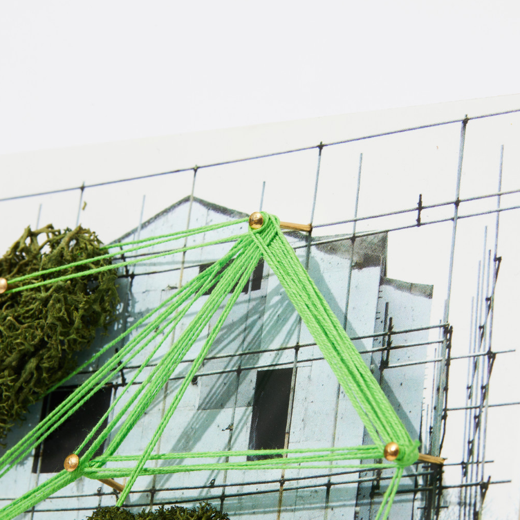 끝으로 못 사이를 실로 이어 건물과 자연이 얽힌 화면을 완성합니다.