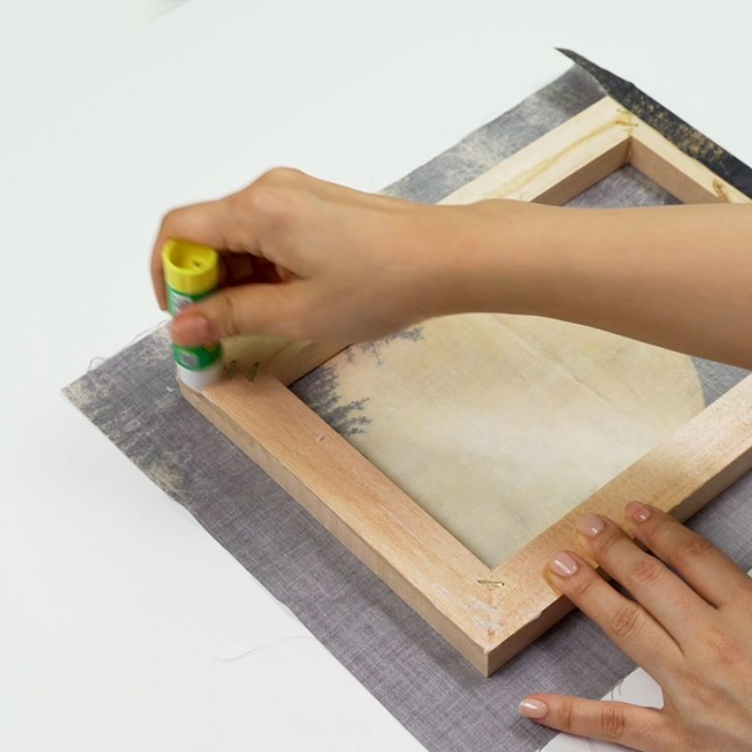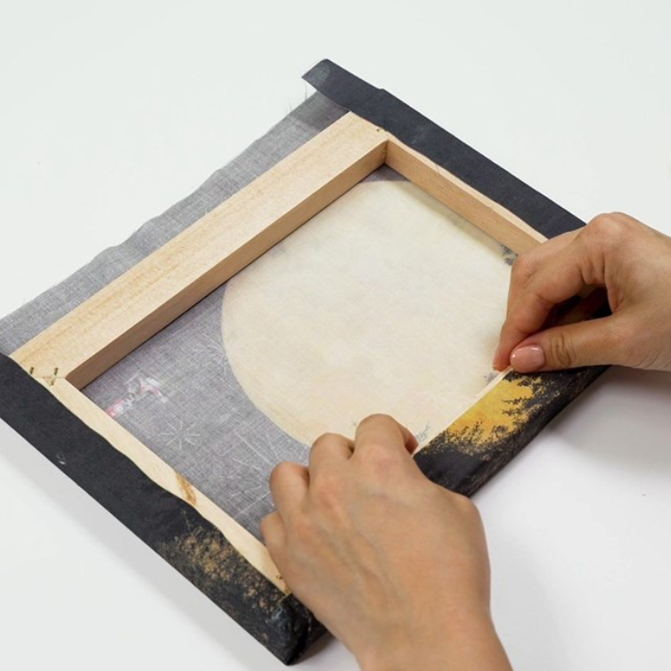 다음으로 작품 이미지가 인쇄된 자수 도안을 나무 틀 위에 올려 단단히 고정합니다.